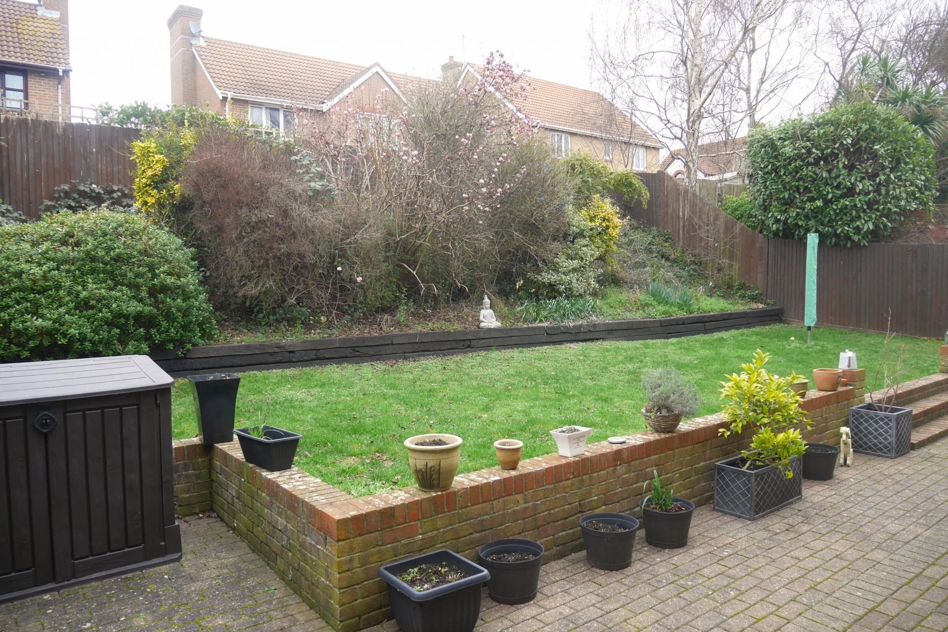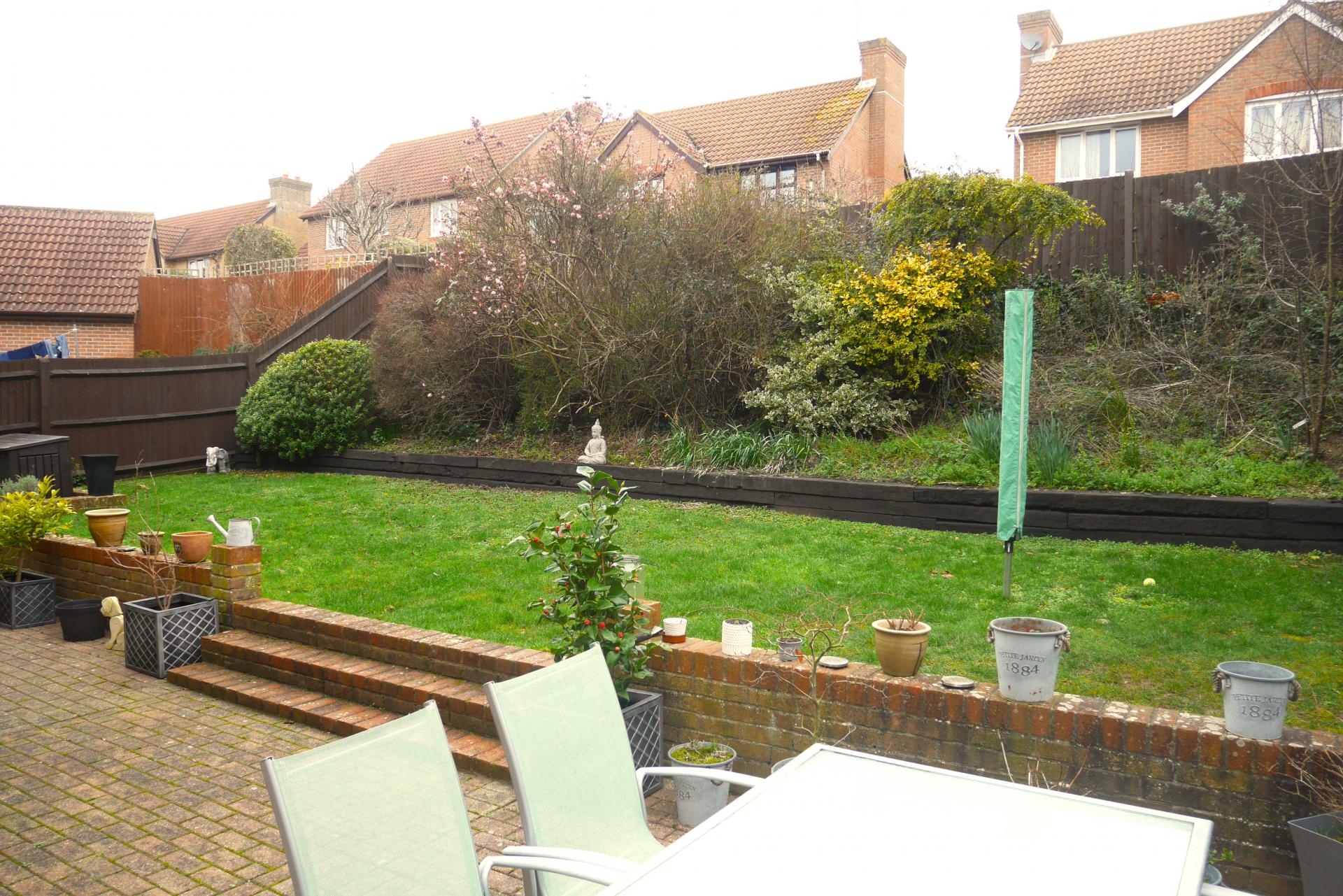 OUTSIDE To the rear is a paved patio area with steps and brick retaining wall leading to lawned garden with further wooden fender surrounds and terraced style garden with shrubs and bushes.