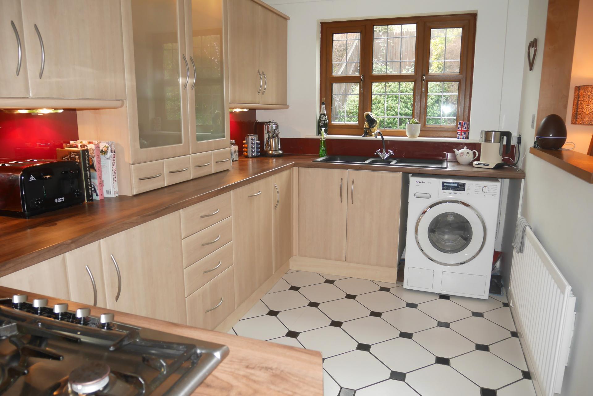 KITCHEN 18' 8" x 7' 3" (5.69m x 2.21m) Comprehensive range of matching wall and floor units with roll top work surface, inset 1½ bowl sink unit with mixer tap and cupboard space under, plumbing for washing machine, radiator, serving hatch to dining room, double glazed window to rear aspect, red glass splashback, under unit lighting, two wall mounted units with glazed panelled doors and drawers under, range of drawer units, peninsular style divide with breakfast bar to one side and five ring gas hob, extractor hood, fan and light over, stable style double glazed door to side aspect, tall larder pull-out storage cupboard, eye-level double oven and grill with storage cupboards over and under, shelf for microwave, integrated fridge and freezer with matching door, tiled flooring, ceiling spotlights and coving, radiator, dimmer switch.