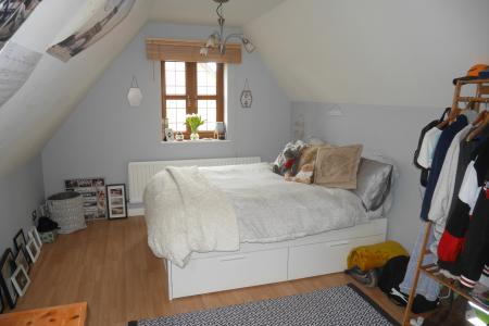 BEDROOM 2 18' 0" x 10' 6" (5.49m x 3.2m) Measurements taken from approximately 2'10" off floor level with eaves to side ceiling restricting headroom, Velux skylight window, double glazed window to front aspect, radiator, wood laminate flooring, panelled door.