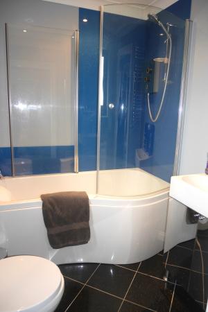 EN-SUITE BATHROOM White suite comprising; P shaped panelled bath with mixer tap and shower attachment with separate shower over, curved shower screen, vanity unit with wash hand basin, mixer tap and cupboards under, glass splashback, black gloss tiled flooring, close coupled w.c., with dual flush, double glazed frosted window to front aspect, chrome heated towel rail, ceiling spotlights, sliding door, extractor fan.