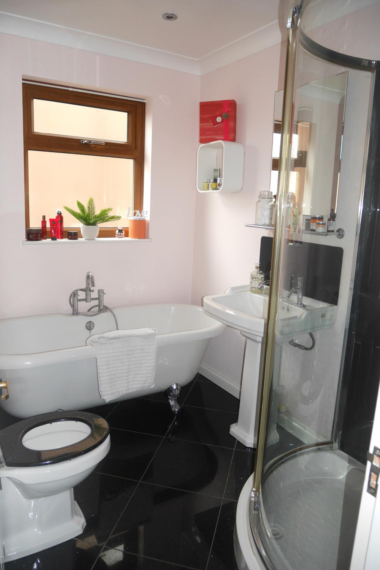 FEATURE BATHROOM White suite comprising; Claw footed double ended free standing bath with central mixer tap and shower attachment, pedestal wash hand basin with tiled splashback, low level w.c., chrome heated towel rail, double glazed frosted window on side aspect, corner shower cubicle with panelled door and Mira shower, gloss tiled flooring, ceiling spotlights, extractor fan, ceiling coving.