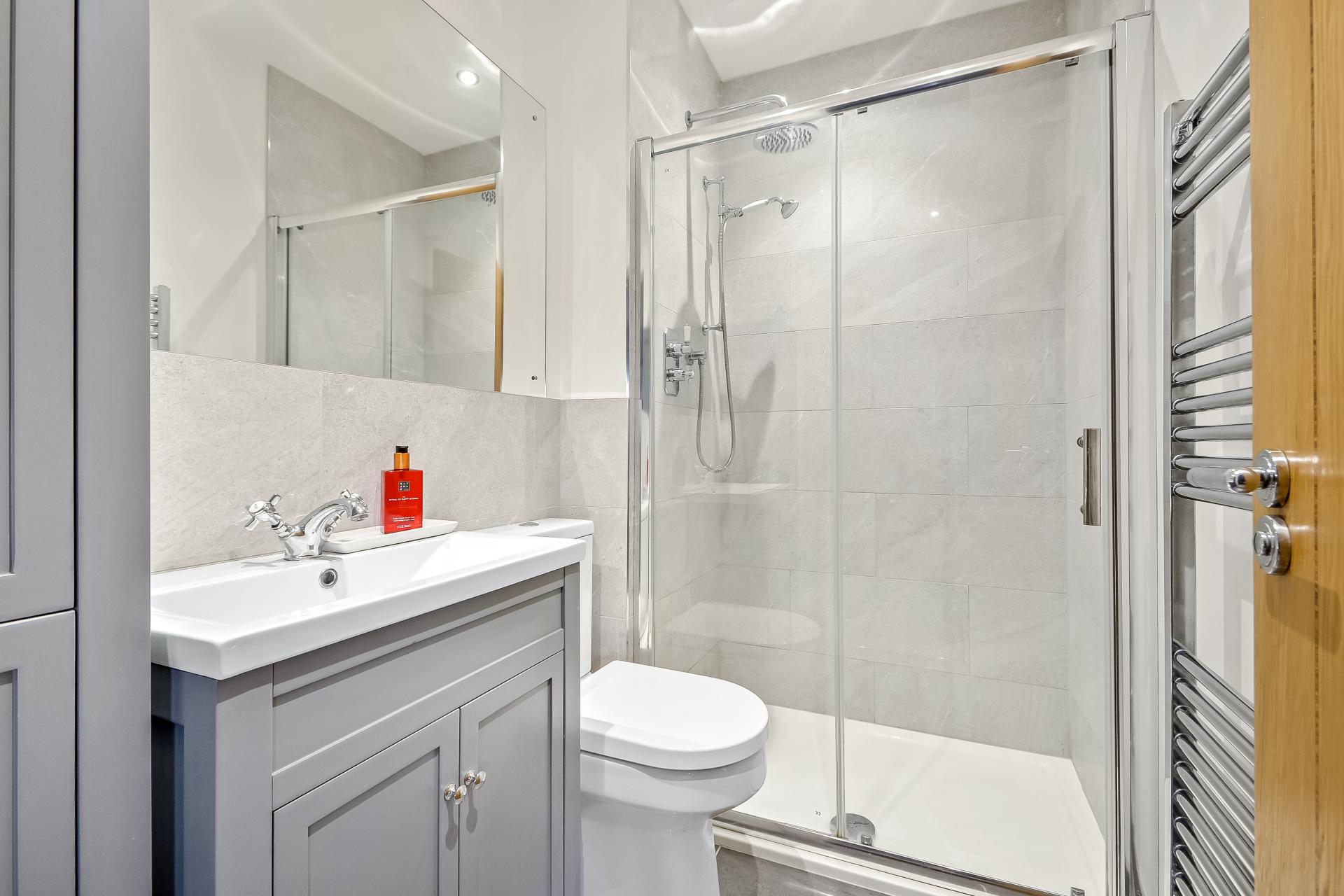 EN-SUITE SHOWER ROOM Fully ceramic tiled 1½ size shower cubicle with drench style hood and separate shower attachment, close coupled w.c., with dual flush, wash hand basin with mixer tap and cupboards under, tall cabinet, large mirror, extractor fan, ceiling spotlights, chrome heated towel rail.