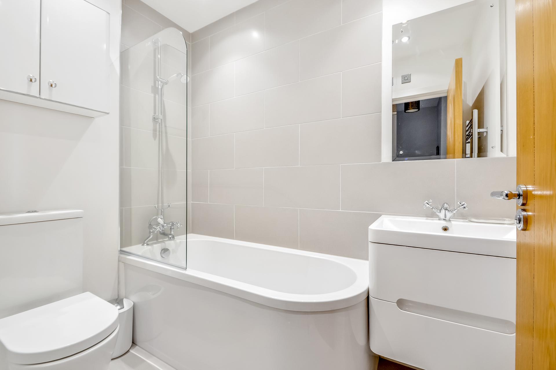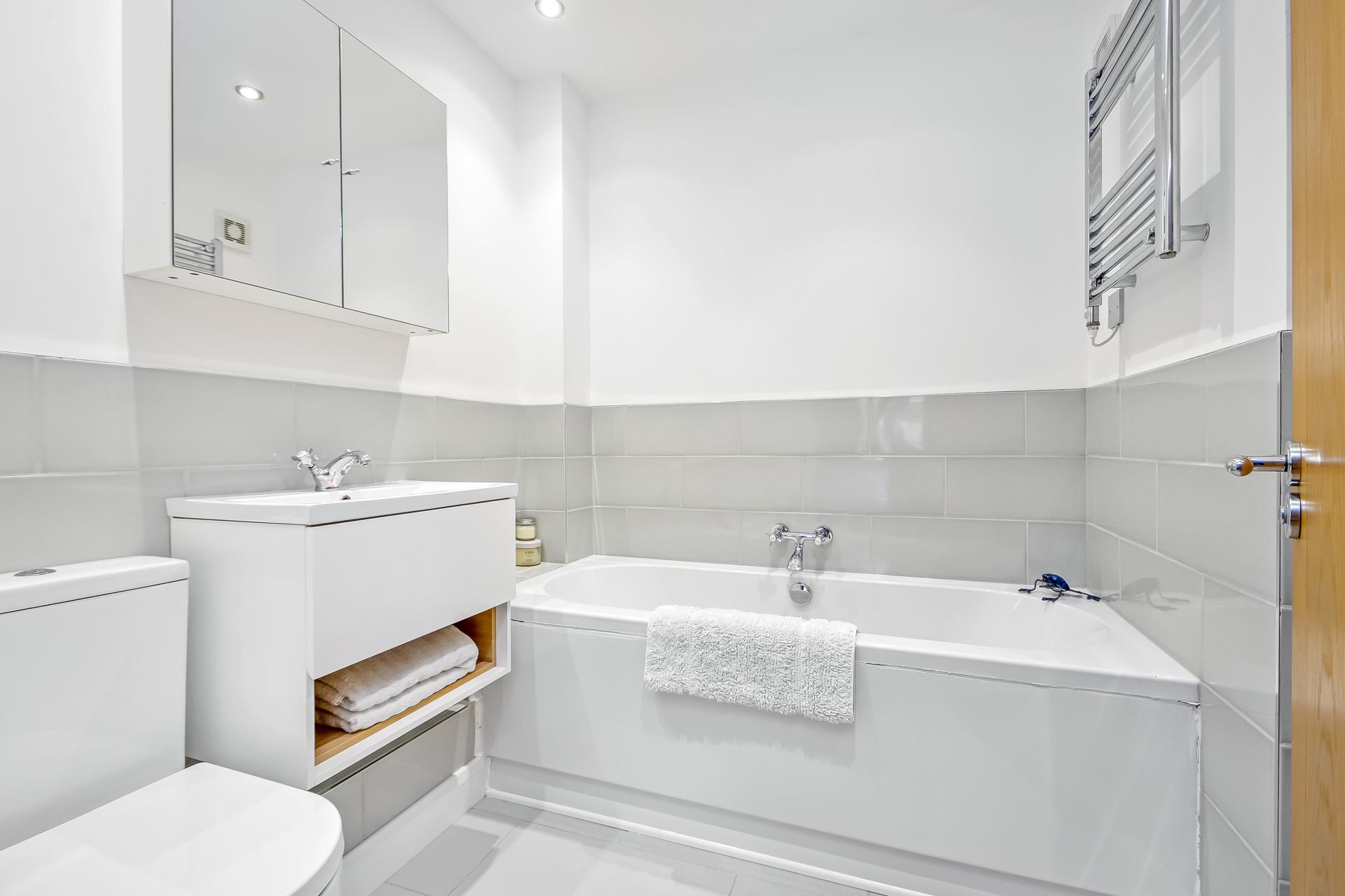 EN-SUITE BATHROOM White suite comprising; double ended panelled bath with wall mounted taps and shelf to one end, vanity unit with wash hand basin, mixer tap and shelving under, tiled surrounds, mirror fronted medicine cabinet over, close coupled w.c., with dual flush, shower cubicle with drench style hood and separate shower attachment, panelled door, tiled flooring, chrome heated towel rail, ceiling spotlights.
