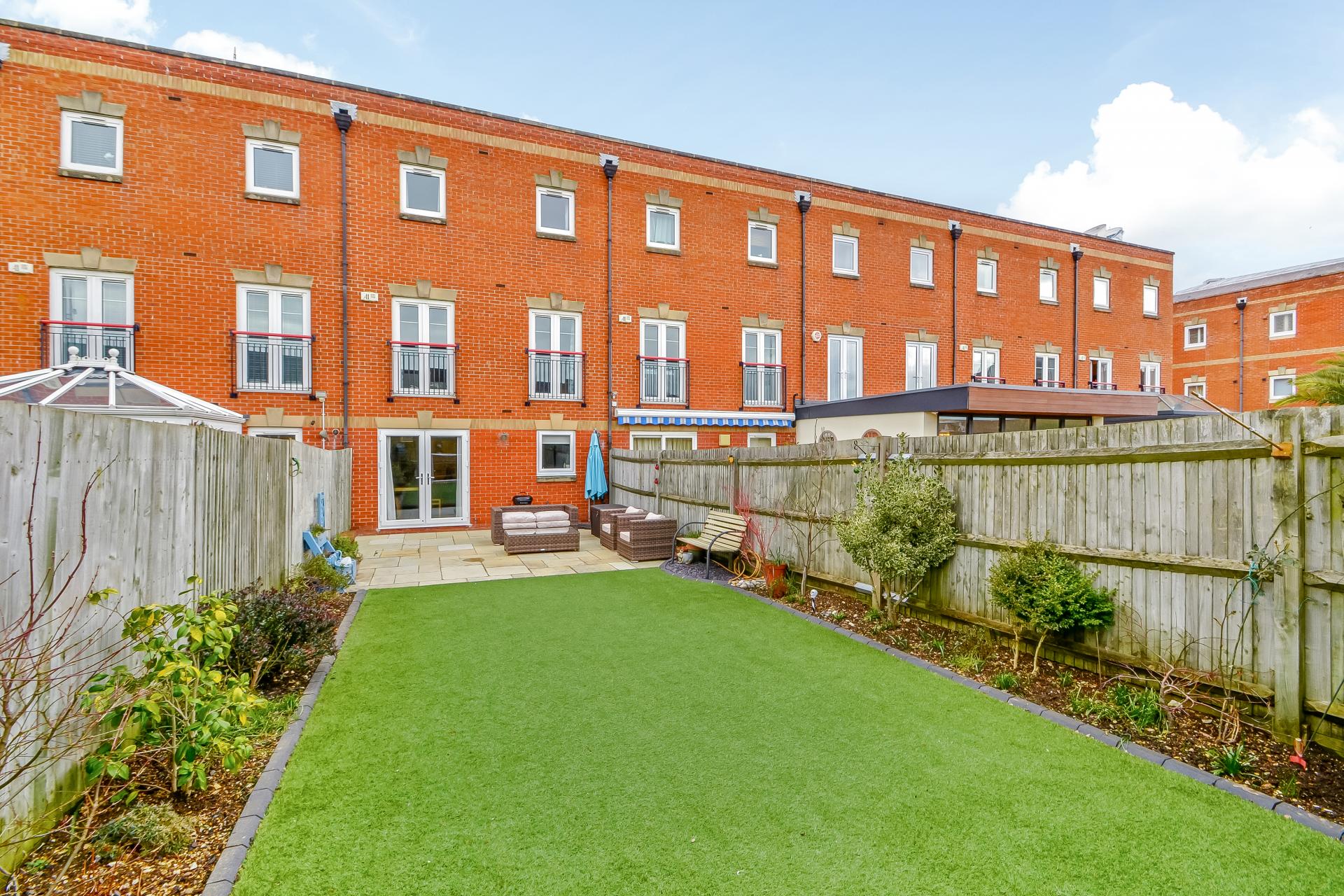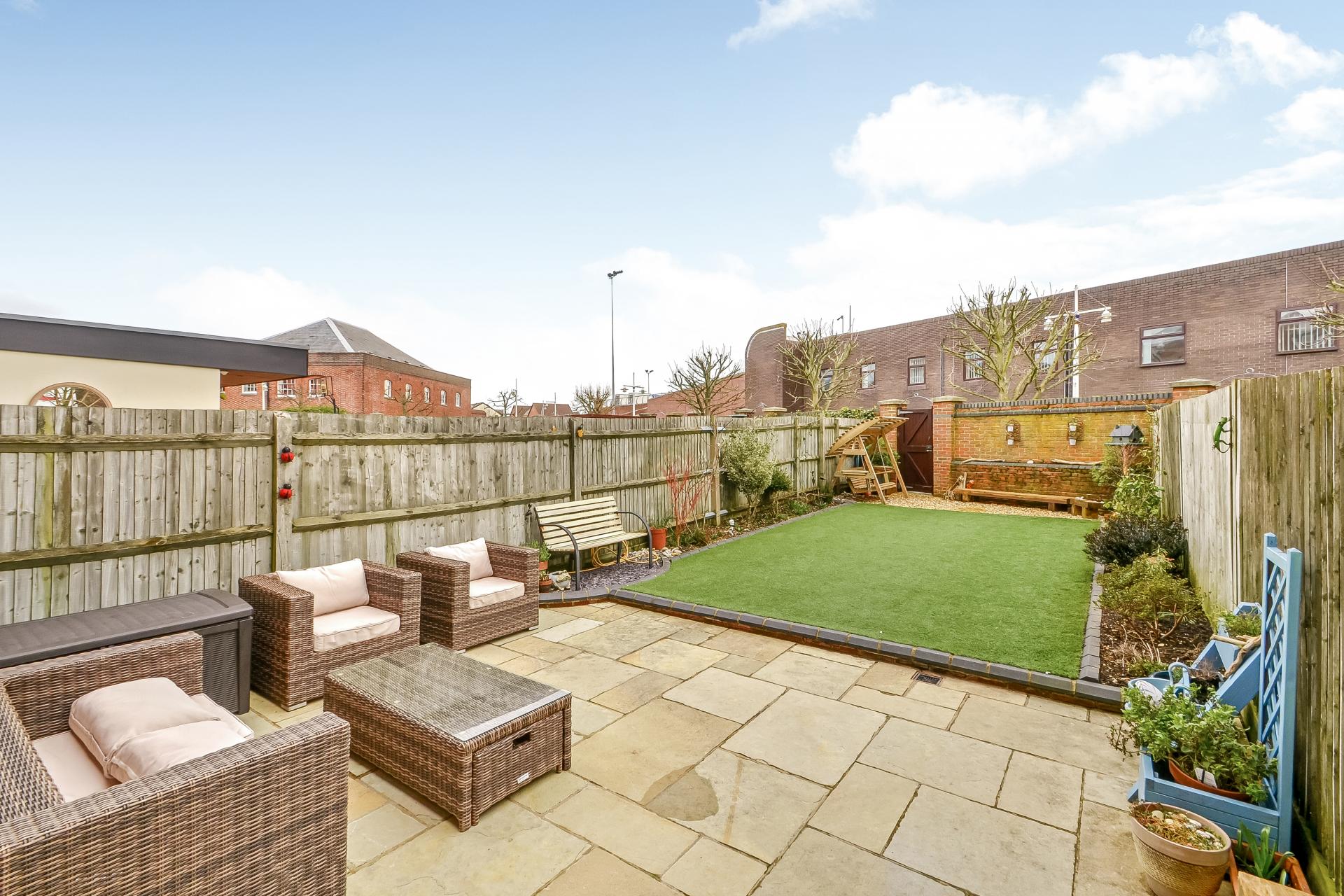 OUTSIDE To the rear is a low maintenance enclosed garden with fence panelling to either side and high brick retaining wall to the rear with gateway leading onto Millennium Walk, the garden has two feature areas, one being a large patio with flagstone style flooring, the other with low maintenance artificial grass with flowering shrub borders and a shingled area to one end, range of shrubs and plants.
