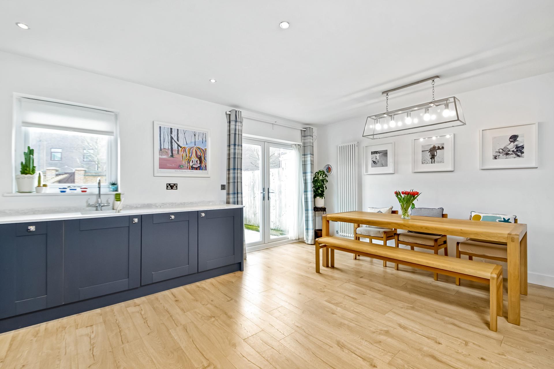 KITCHEN/DINING ROOM 17' 1" x 14' 11" maximum, decreasing to 12'10" (5.21m x 4.55m) Dining area; matching wood laminate flooring, power points, contemporary style tall radiator, twin double glazed doors leading to rear garden, ceiling spotlights. Kitchen; Comprehensive range of light grey fitted wall units and dark blue floor units with composite work surface, incorporating inset sink unit with mixer tap, Brita filter tap and drainer to one side, range of integrated appliances including dishwasher, tall fridge/freezer with matching doors, chrome fronted power points, inset Neff induction hob with extractor hood, fan and light over, eye-level Neff double oven with tilt and hide door, integrated bin drawer, matching wood laminate flooring, double glazed window to rear aspect overlooking garden with blinds, ceiling spotlights, one wall mounted unit housing boiler supplying domestic hot water and central heating (not tested), part-glazed panelled door leading to hallway.