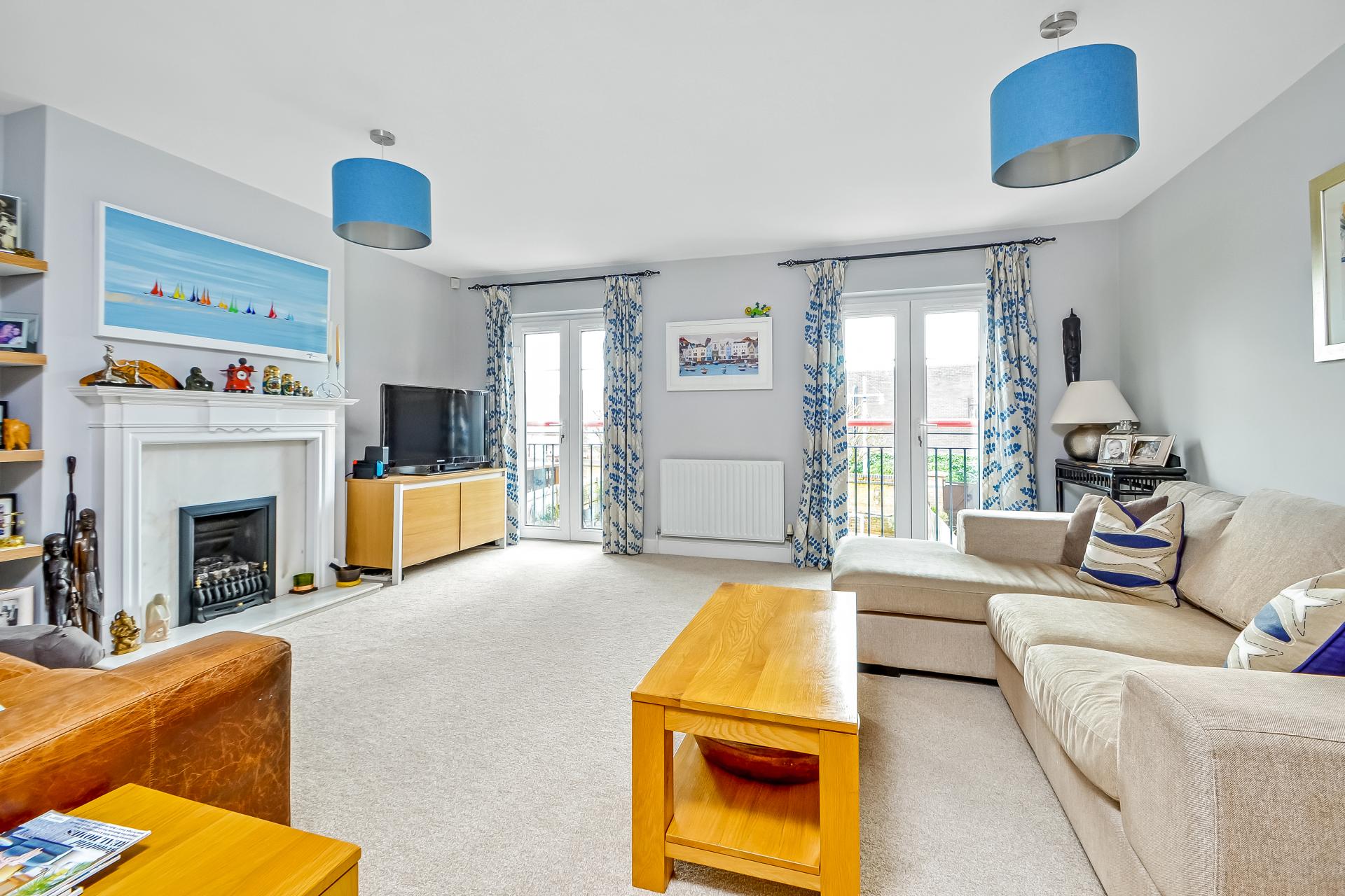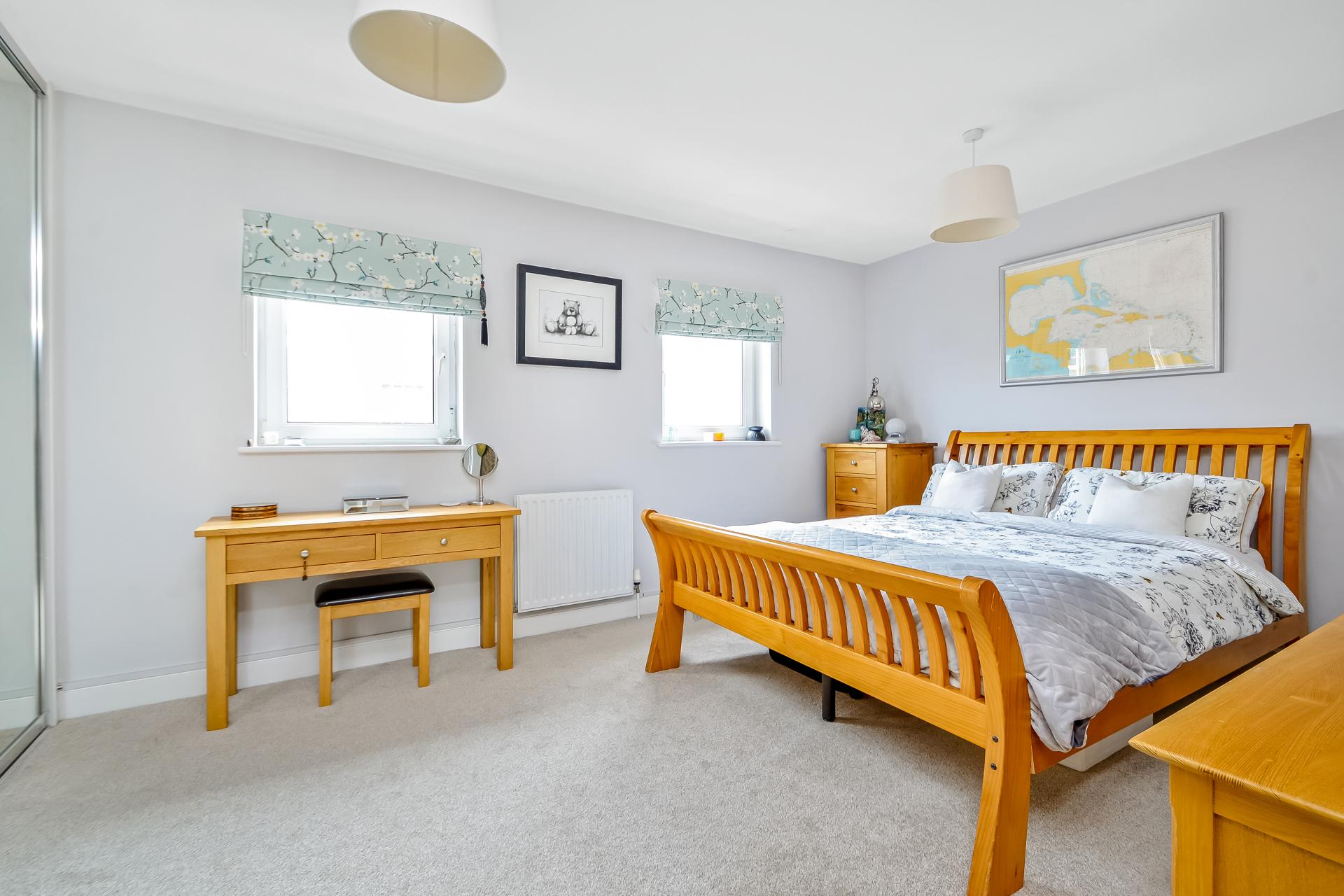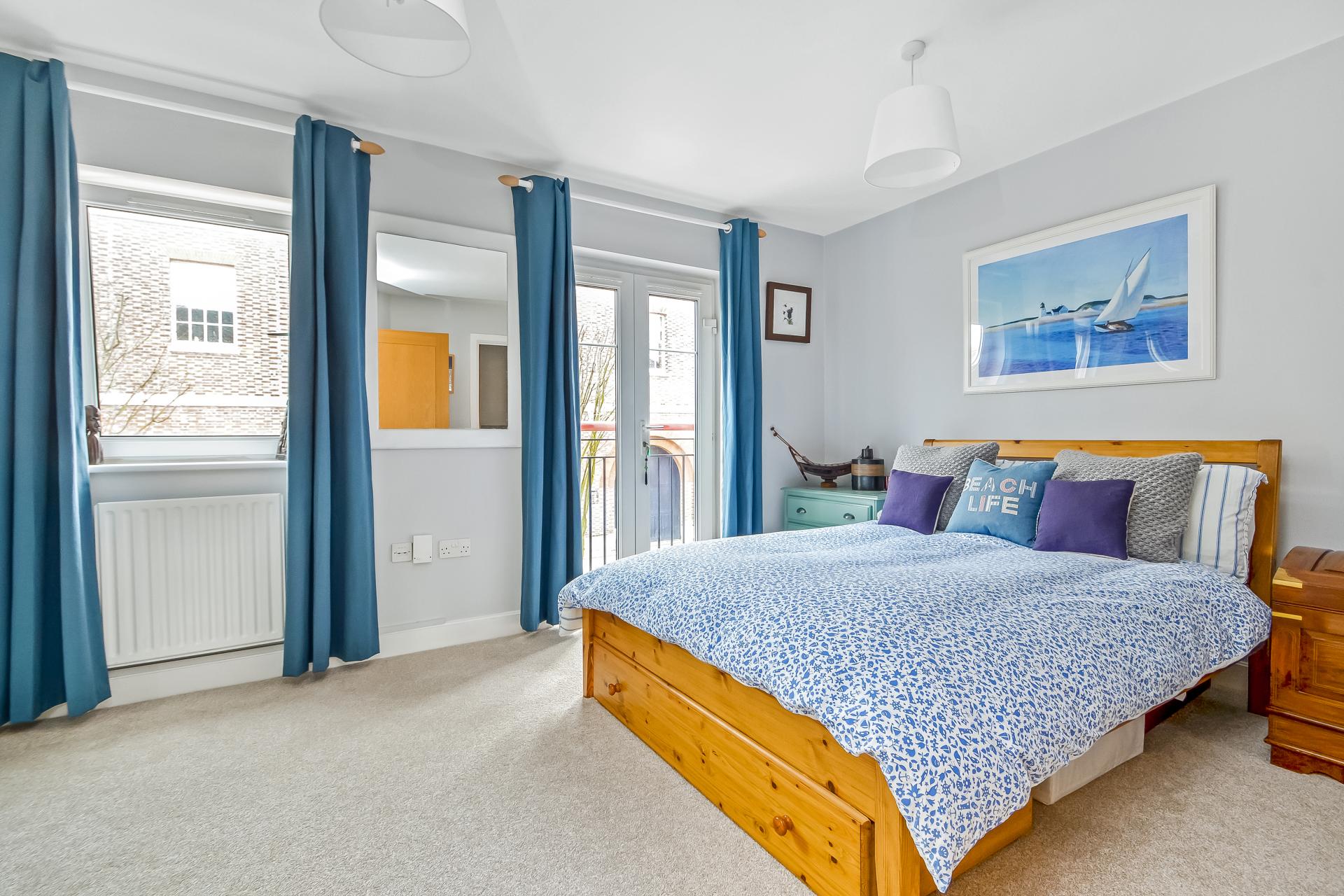 BEDROOM 1 17' 2" maximum x 11' 0" (5.23m x 3.35m) Large floor to ceiling built-in mirror doored wardrobe to one wall with hanging space and shelving, twin double glazed windows to front aspect with partial views towards the harbour, double radiator, power points, door to: