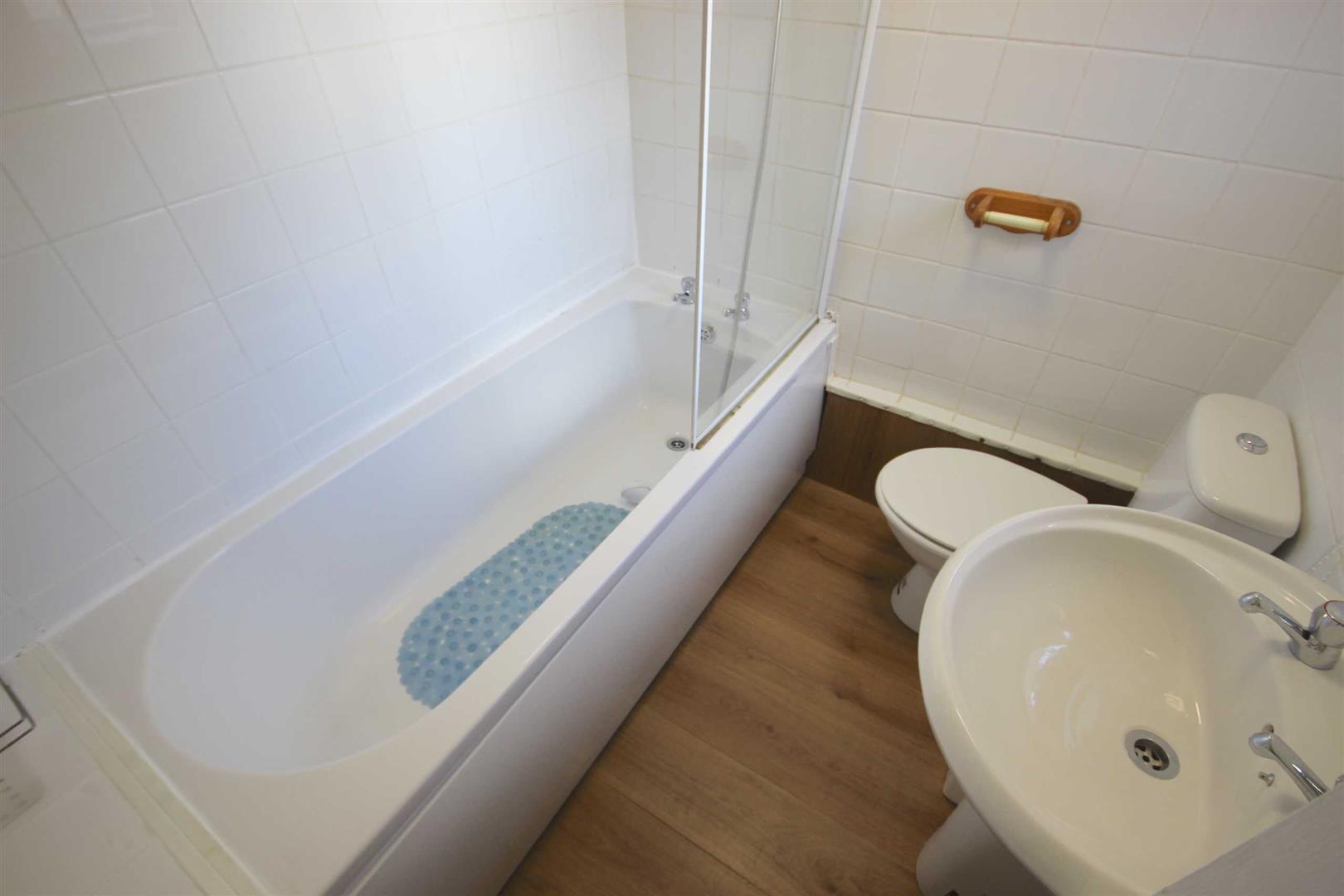 Bathroom - Tiled surround, textured ceiling, window to rear elevation, panel enclosed bath, low level flush WC, pedestal hand wash basin, laminate flooring.
