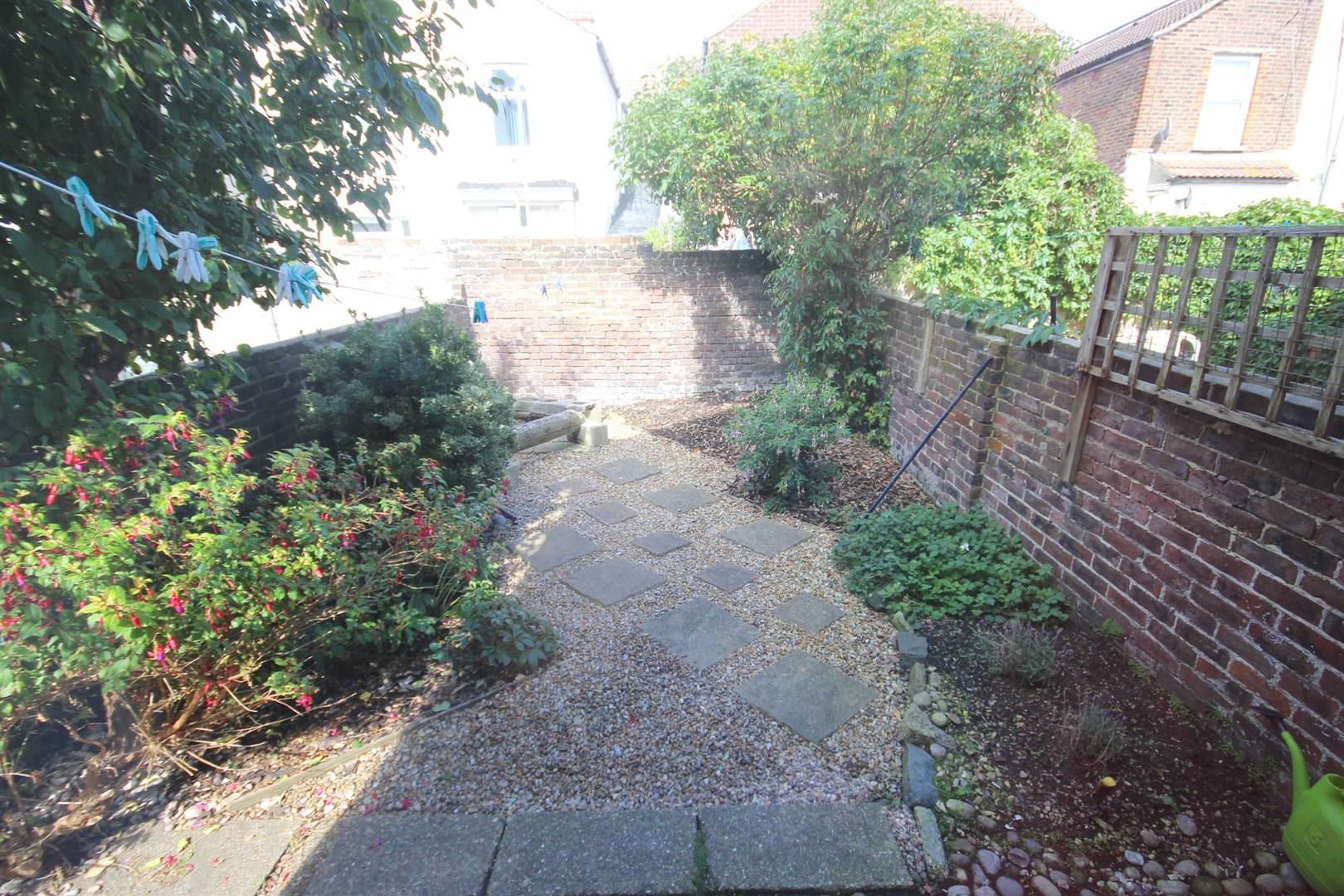 Rear Garden - Wall enclosed rear garden, patio area, stepping stones, shrub borders.