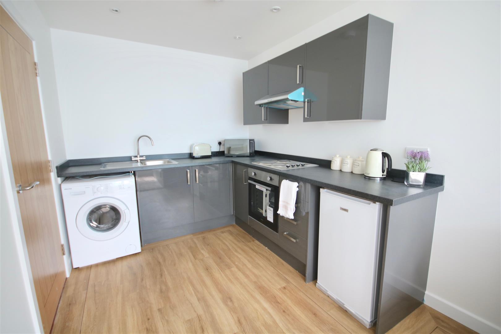 Kitchen/Lounge - Large lounge space with kitchenette area consisting of a range of matching, high gloss wall and base units with plumbing for washing machine, new hob and oven, extractor fan overhead, stainless steel sink and drainer unit, space for fridge freezer.