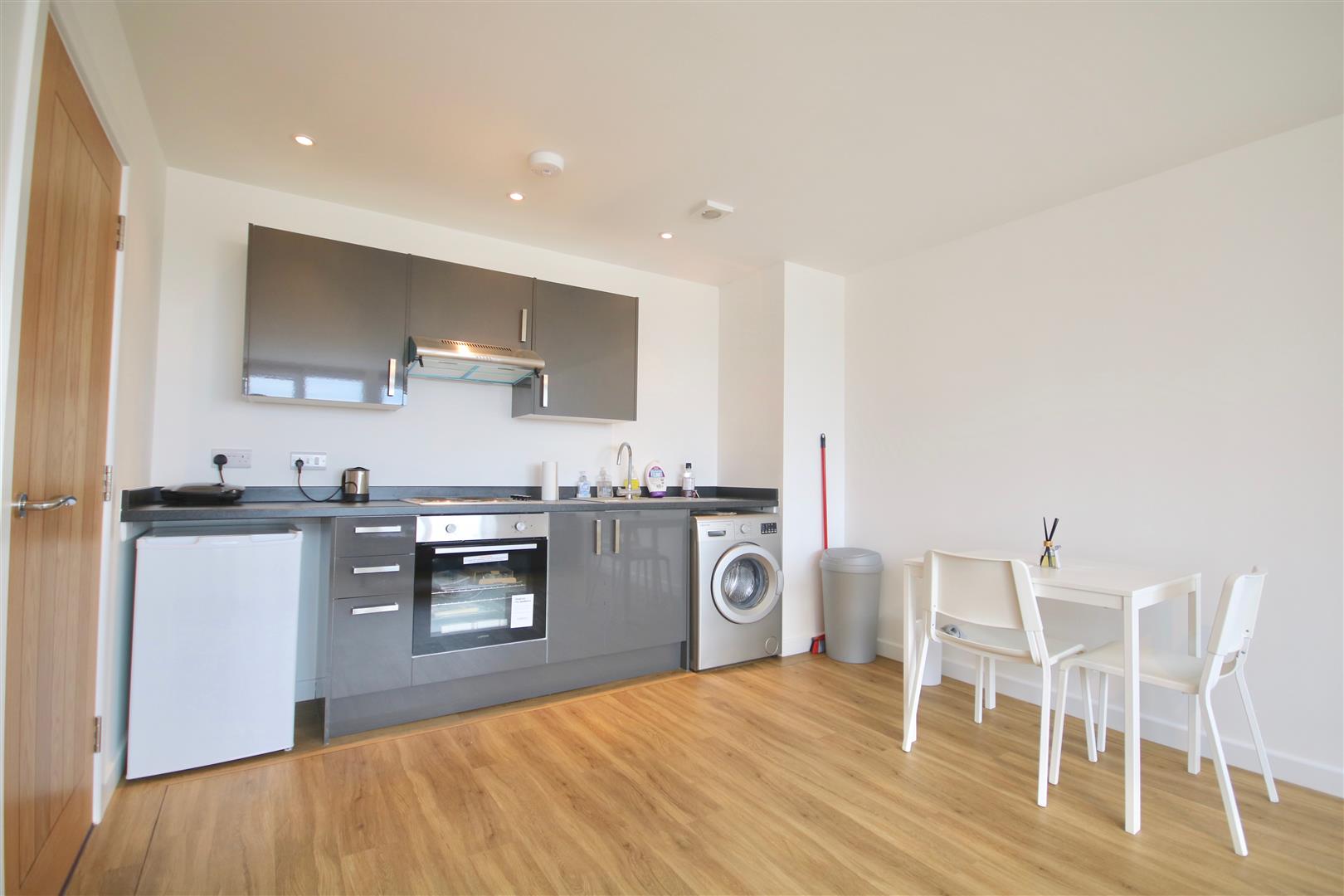 Kitchen/Lounge/Diner - Large lounge space with kitchenette area consisting of a range of matching, high gloss wall and base units with plumbing for washing machine, new hob and oven, extractor fan overhead, stainless steel sink and drainer unit, space for fridge freezer.