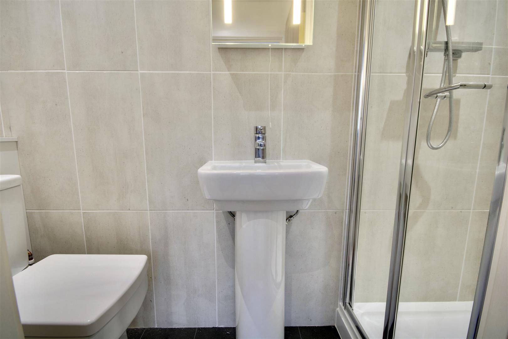 Bathroom - High quality modern bathroom suite comprising of low level w/c and hand wash basin, shower cubiocle with glass shower screen, splashback tiling to walls, chrome heated towel rail.