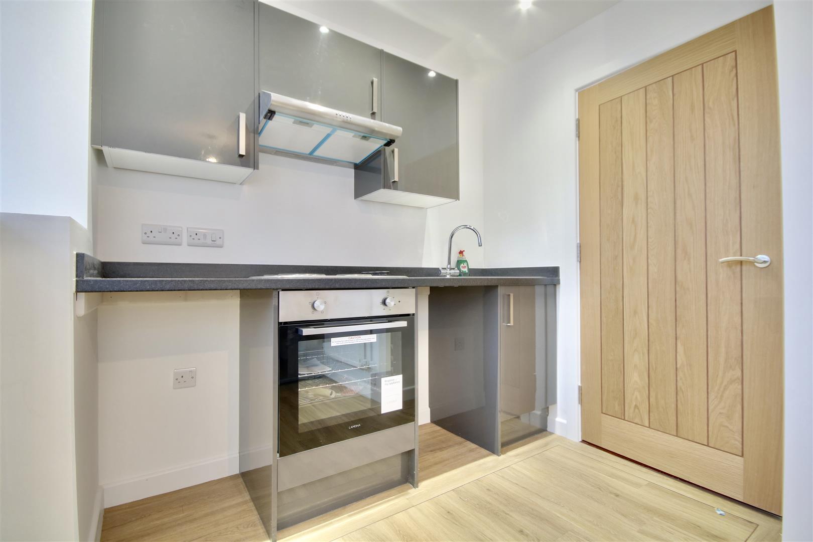 Kitchen/Lounge - Large lounge space with kitchenette area consisting of a range of matching, high gloss wall and base units with plumbing for washing machine, new hob and oven, extractor fan overhead, stainless steel sink and drainer unit, space for fridge freezer.