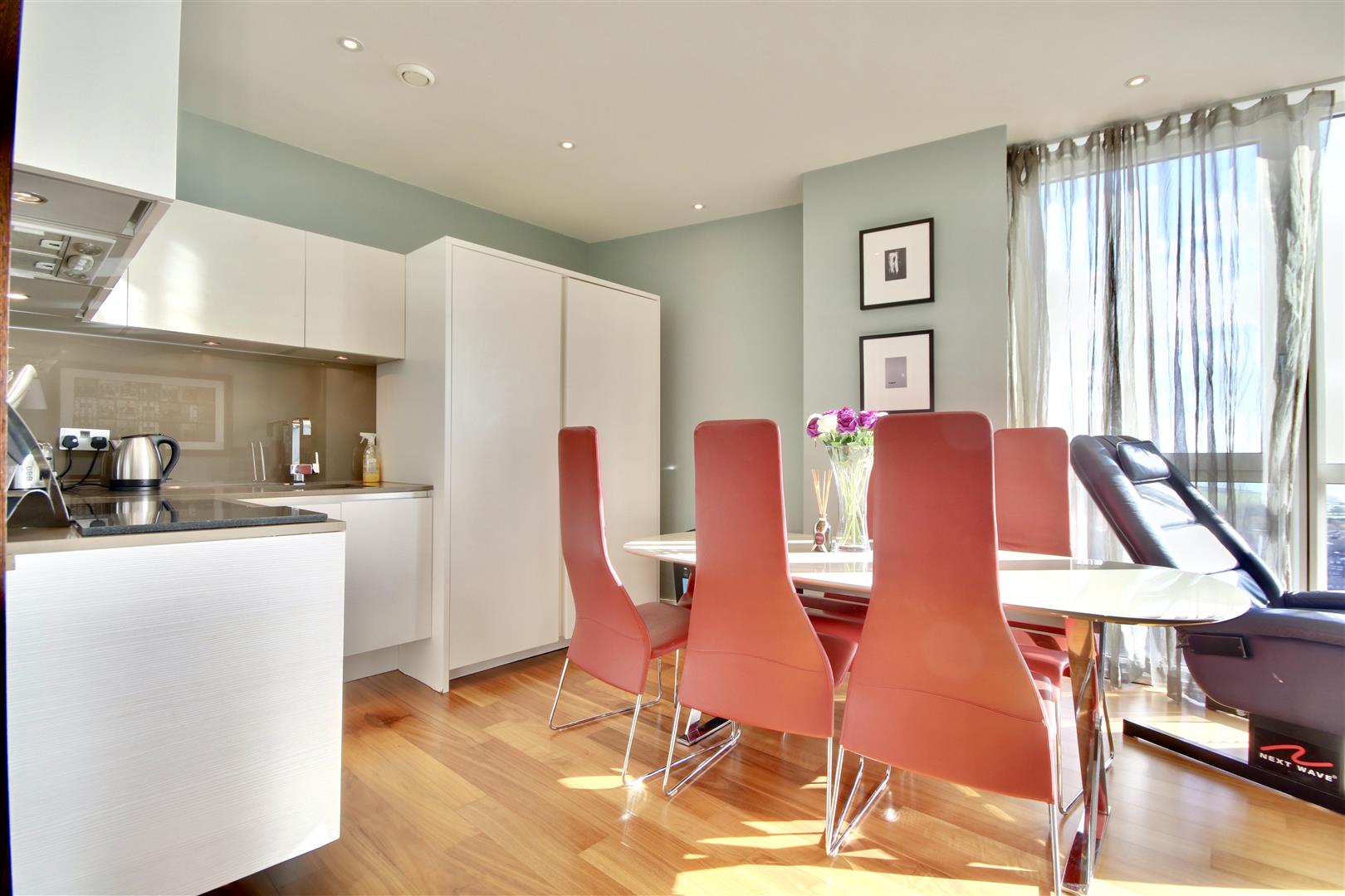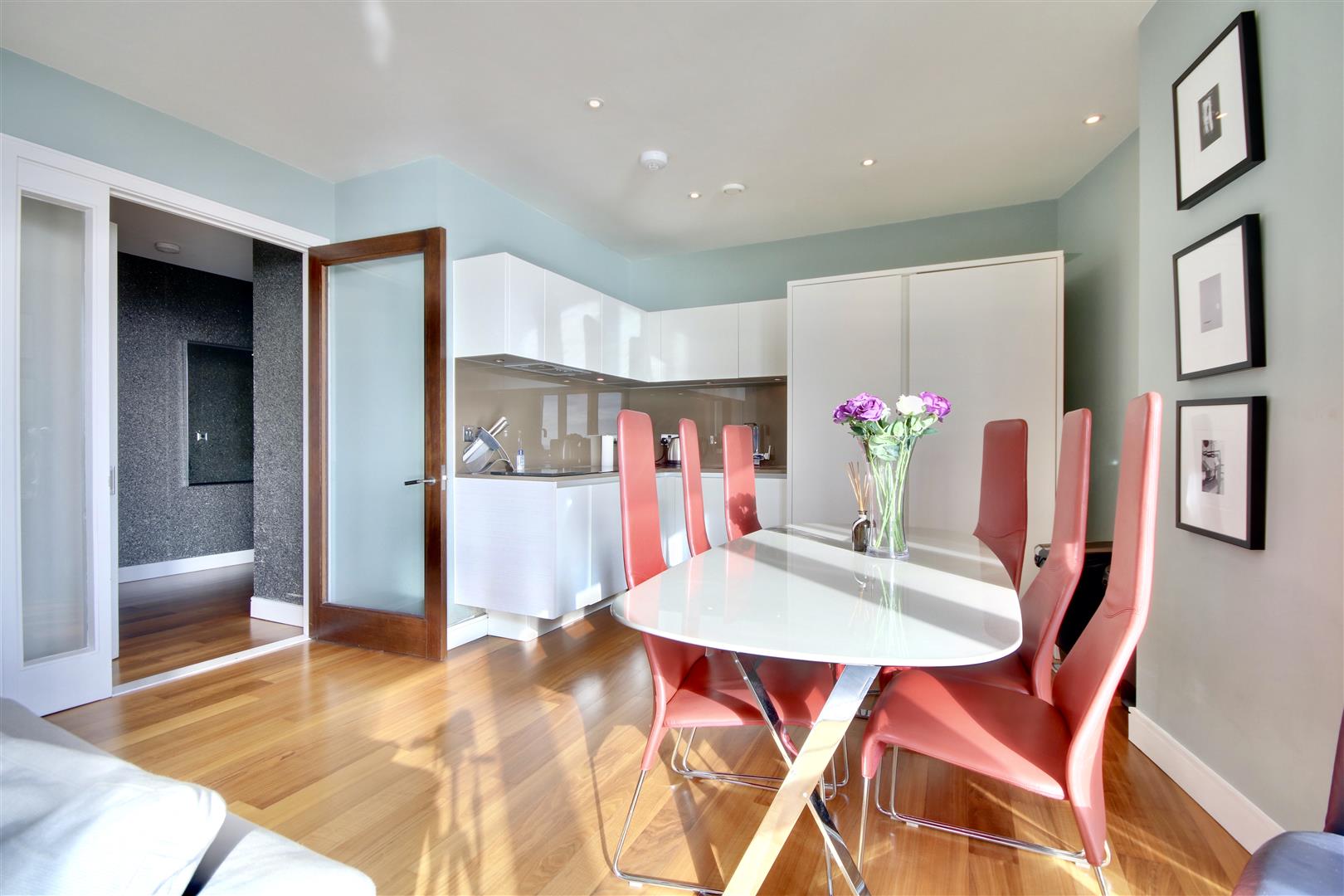 Open Plan Living Area - Floor to ceiling windows make up one entire wall of this curved room, providing breath taking views. There is a modern living area with TV points, underfloor power sockets, storage cupboard and the whole room is finished with solid wood flooring. The kitchen is modern with handle-less units and a high-sheen finish, with integrated appliances and an inset sink in the solid worktops over.