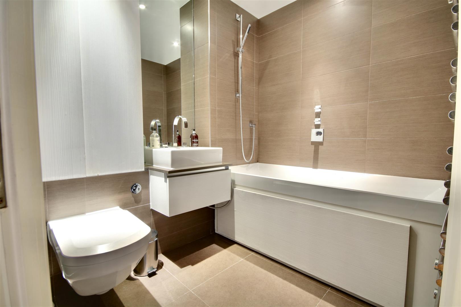 Family Bathroom - Porcelain suite with full tiling. Low-level WC, wash hand basin, heated towel rail and bath with shower over. Porcelain tiled floor.