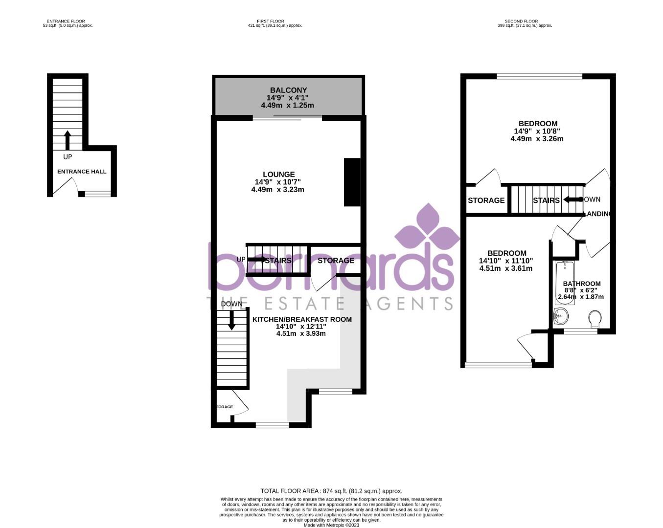 The second floor includes two double bedrooms and a three-piece bathroom.