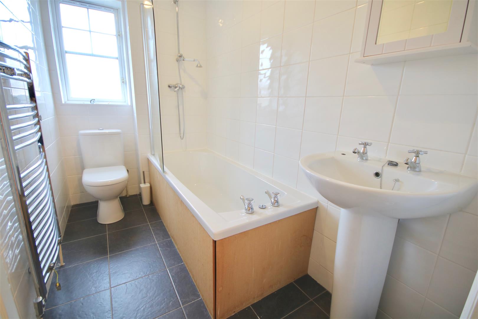 Bathroom - 2.69m x 1.47m (8'10" x 4'10") - Tile flooring and contrasting fully tiled walls, panel bath with shower over, wash basin, toilet, heated towel rail, UPVC double glazed window to the rear elevation