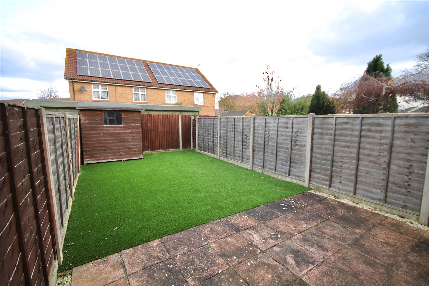 Garden - Low maintenance rear garden which is laid to artificial lawn and a block paved patio, enclosed by panel fences with rear gated access