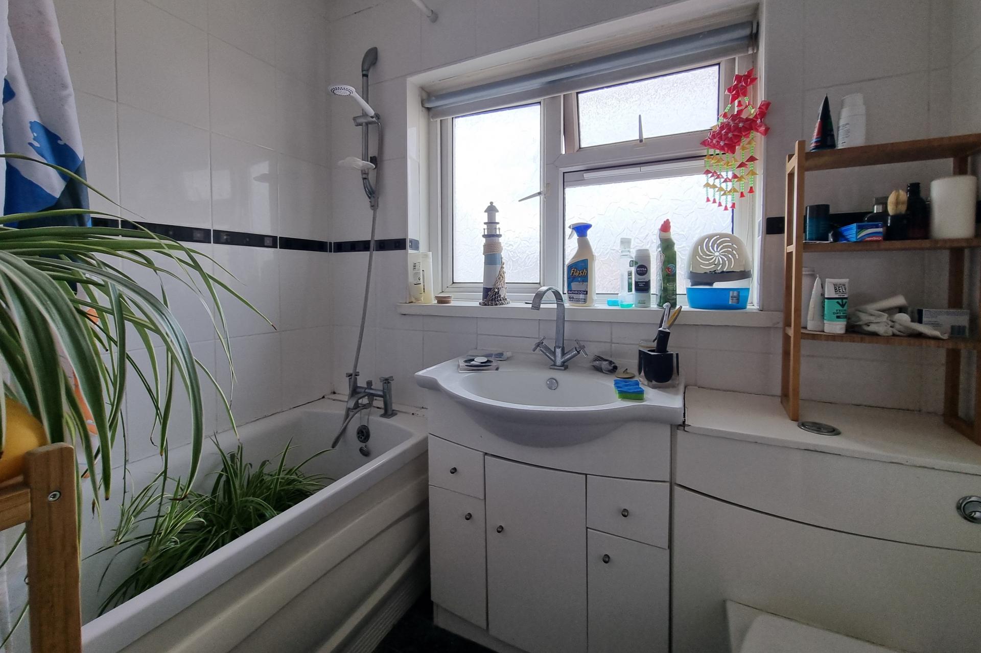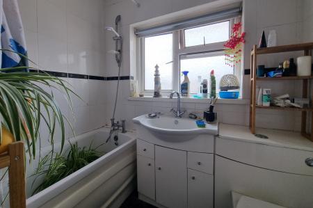 BATHROOM 6' 10" x 5' 0" (2.08m x 1.52m) White suite comprising: panelled bath with mixer tap and shower over, concealed cistern w.c., wash hand basin with cupboards under, basin, radiator, frosted double glazed window.