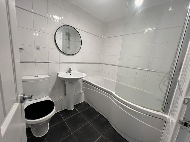 Fully tiled walls, white suite comprising low level wc, pedestal wash hand basin, panel enclosed shower bath with mixer taps and sprayhead, glass shower screen, tiled flooring, extractor fan, heated towel rail.