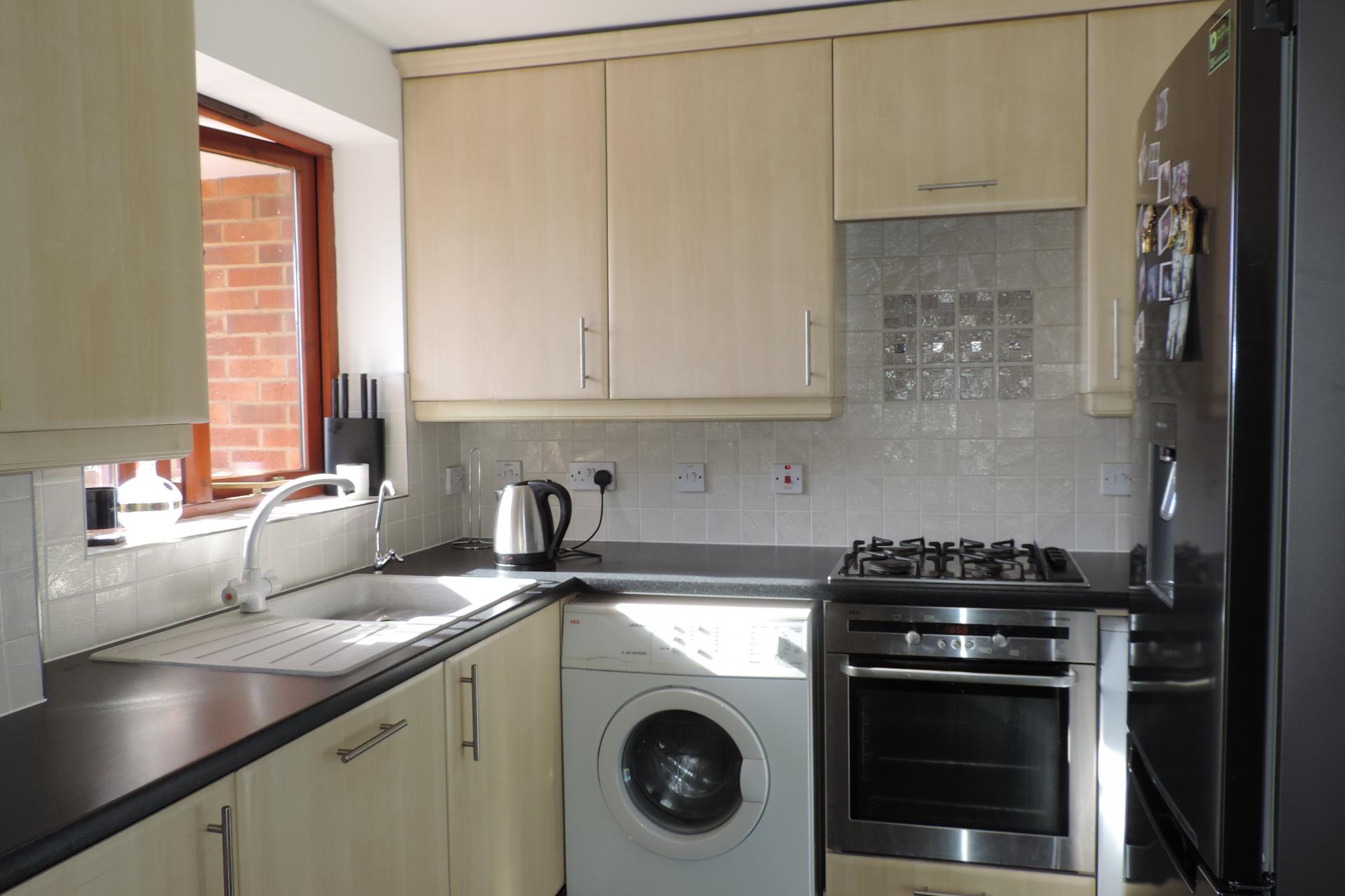 Timber framed double glazed window to front, worksurfaces with a range of matching wall, base & drawer units, single bowl inset sink unit with drainer, filter tap, part tiled walls, countertop lighting, gas hob with cooker hood above and built in electric oven/grill below, washing machine, condensing tumble dryer, integrated dishwasher, space for fridge/freezer, integrated microwave oven, concealed wall mounted boiler, power points, central heating and hot water controls, water softner