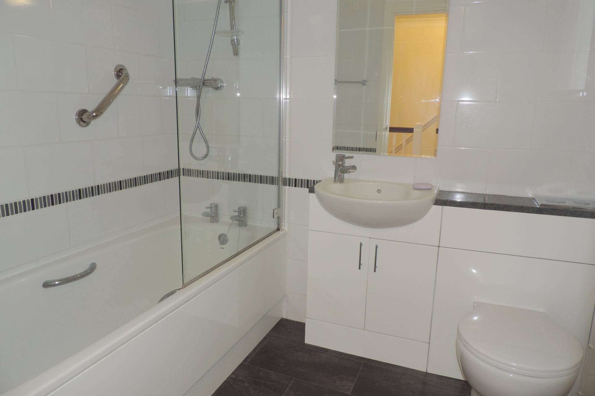 White suite comprising, low level w.c with concealed cistern, vanity unit with mixer taps, panel enclosed bath with single taps and independent shower over bath, glass shower screen, extractor fan, radiator, fully tiled walls, wall mounted medicine cabinet.
