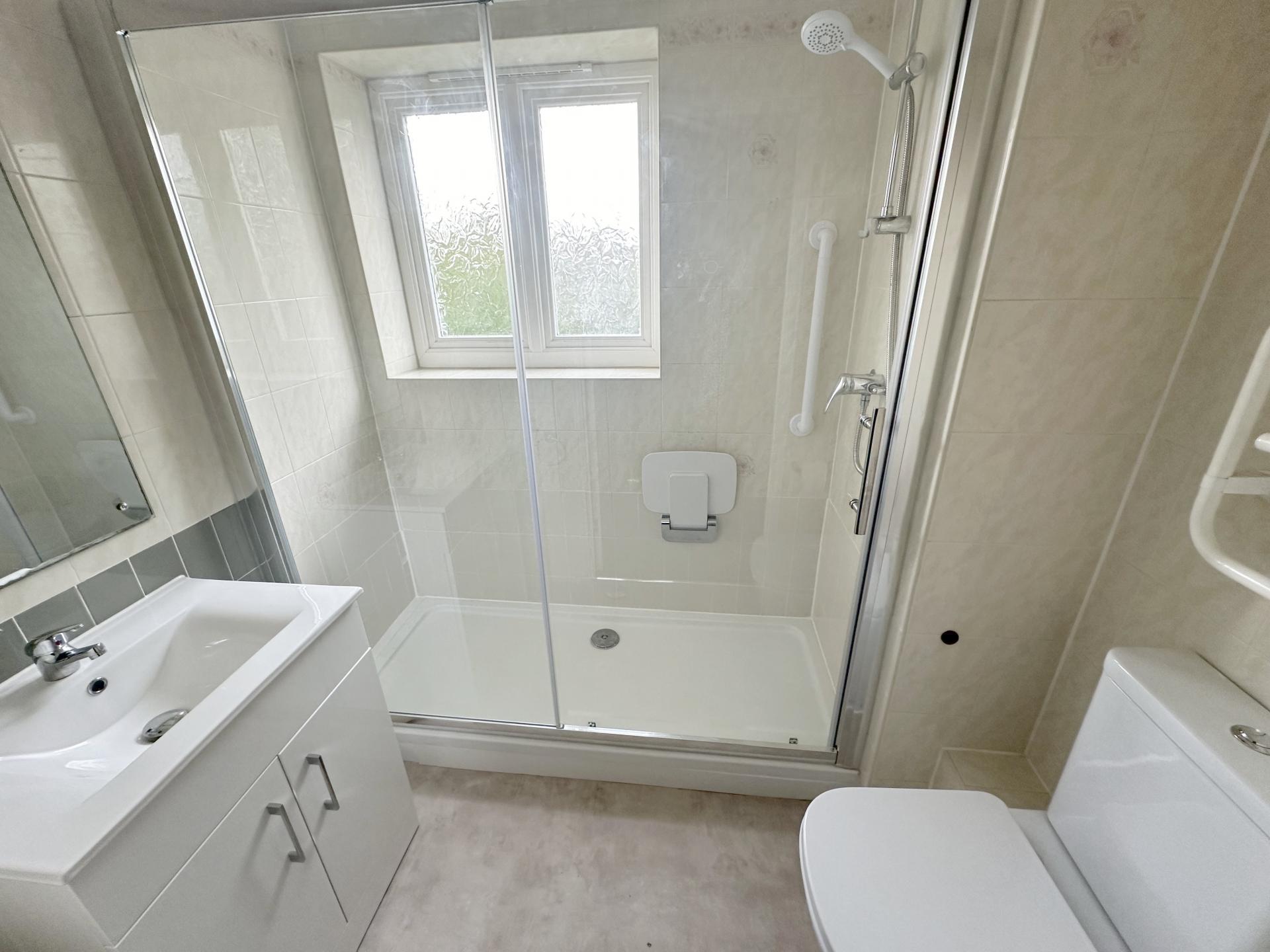 Obscured double glazed window to the front. Large walk-in shower with glass sliding door, wall mounted controls , grab rail and seat. Vanity hand basin with mono bloc tap and storage cupboard below and mirror above. Close couple W.C. heated towel rail and pull cord fan heater.