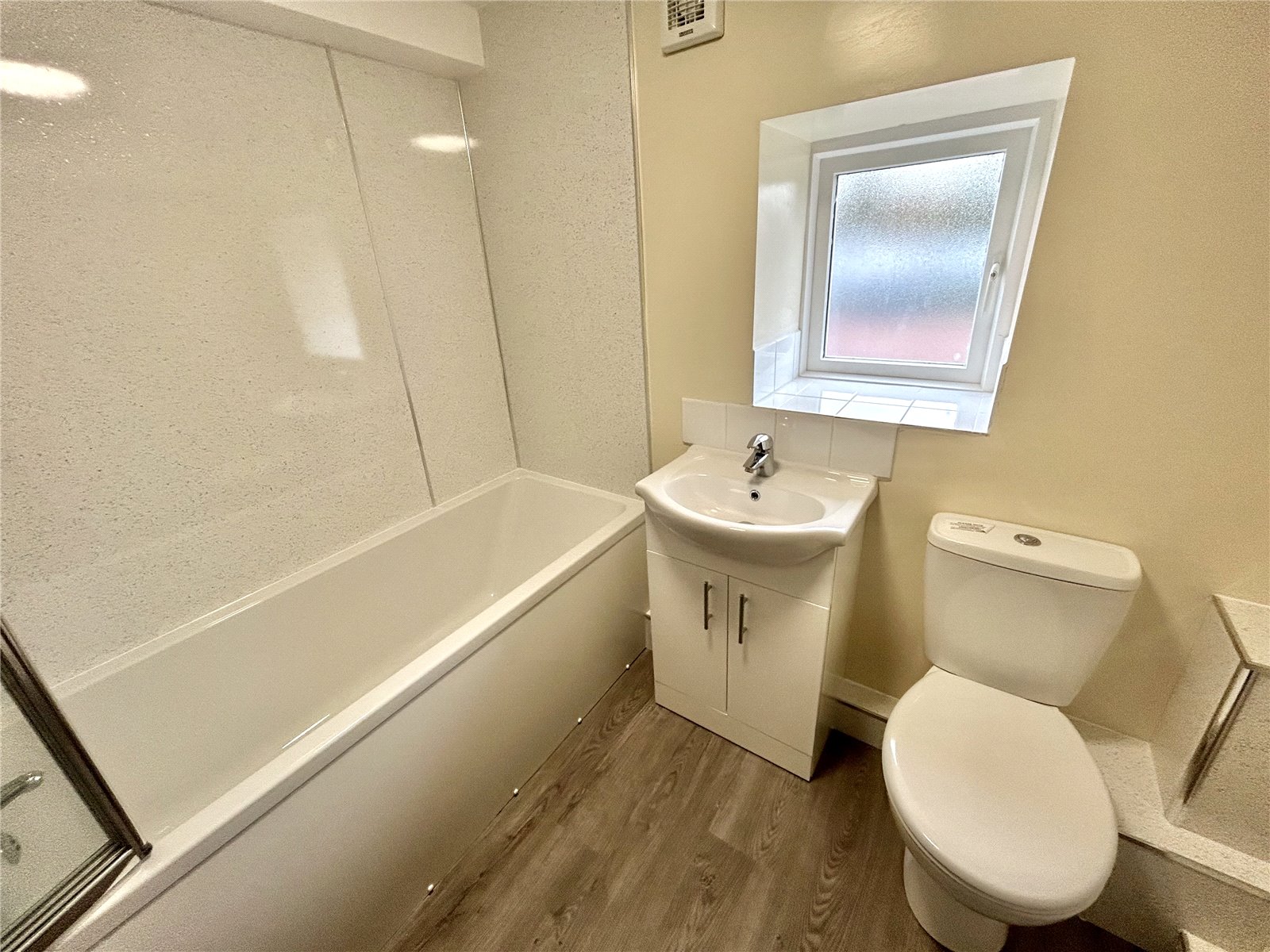 Bathroom comprising bath with shower overhead, glass screen, WC, pedestal washbasin with tiled splashback, extractor fan, laminate floor.
