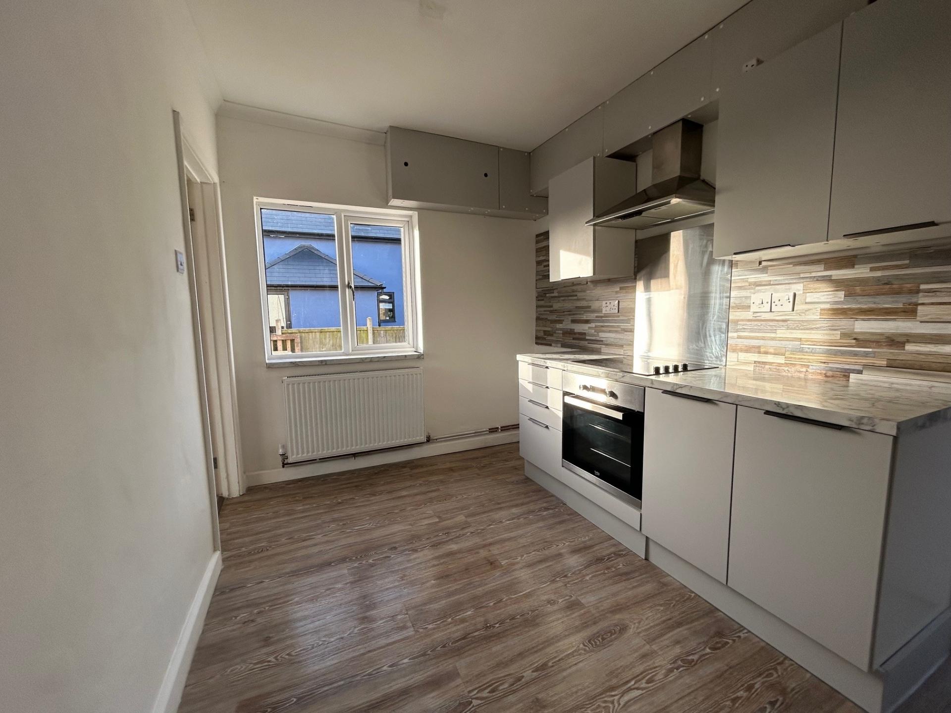 Fitted with a range of wall mounted and base units with worksurface over. Four-ring electric hob with stainless steel cooker extractor over. Single electric oven. Sink and drainer unit. Space and plumbing for washing machine. Space for fridge/freezer. UPVC window to side elevation.