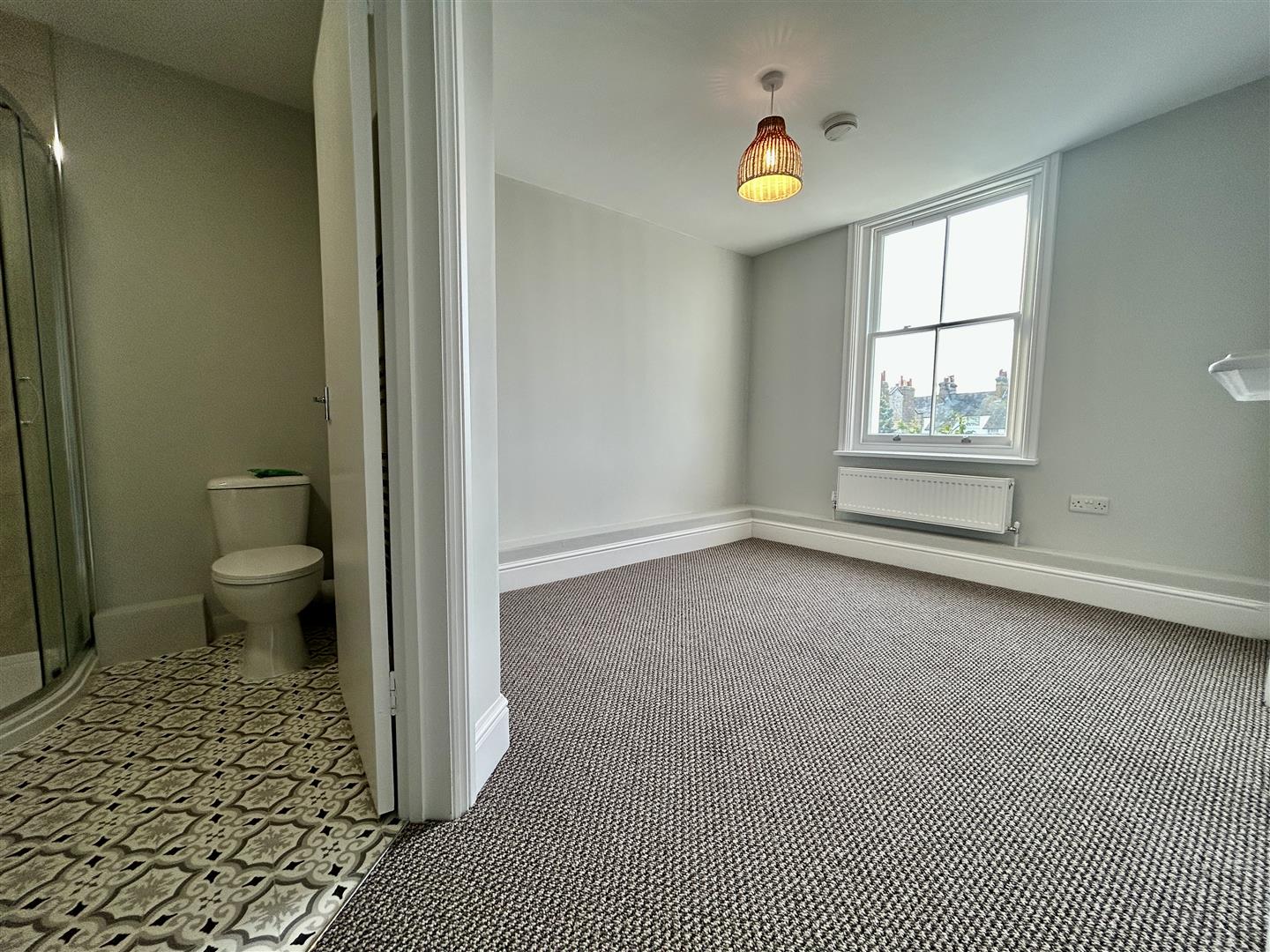 The accommodation comprises a double bedroom, a modern shower room, and an open-plan kitchen/living area with a fitted kitchen and appliances. The living space benefits from two front-facing sash windows with views across Spencer Square and the tennis courts.