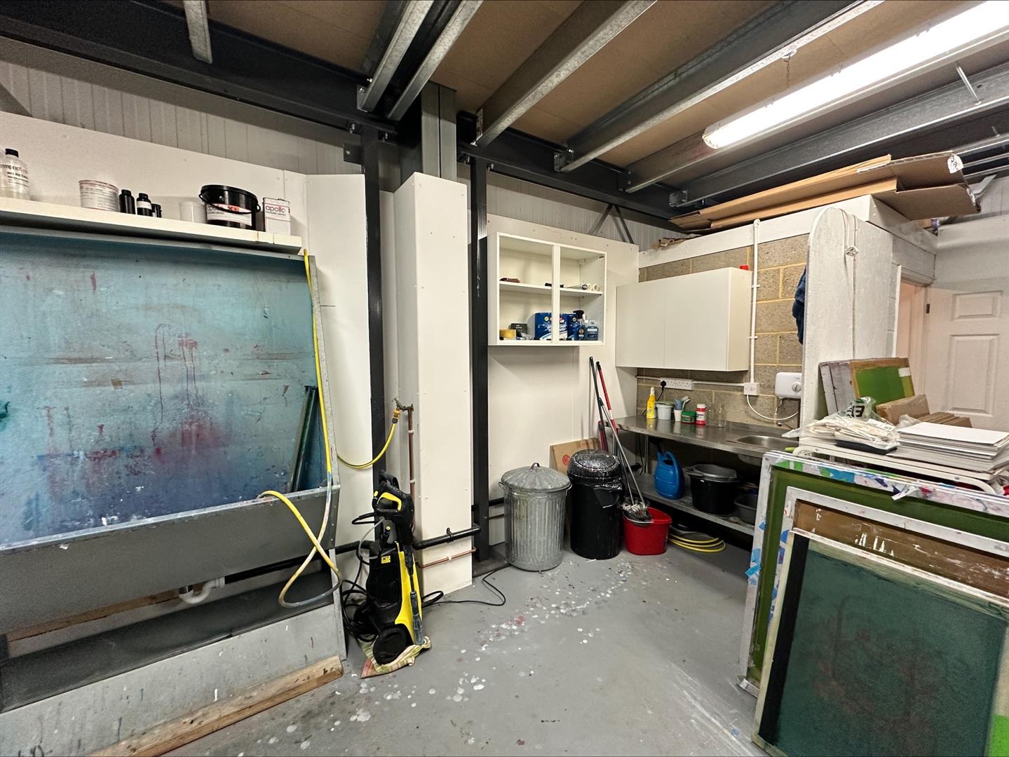 The ground floor features a bright, open-plan industrial/workshop area with shop frontage behind the electric roller shutter door, creating a welcoming first impression for customers or trade visitors. The space is well equipped with lighting and multiple power sockets throughout, allowing for efficient day-to-day operations. A separate WC and sink area are conveniently located on this level, providing useful staff facilities.