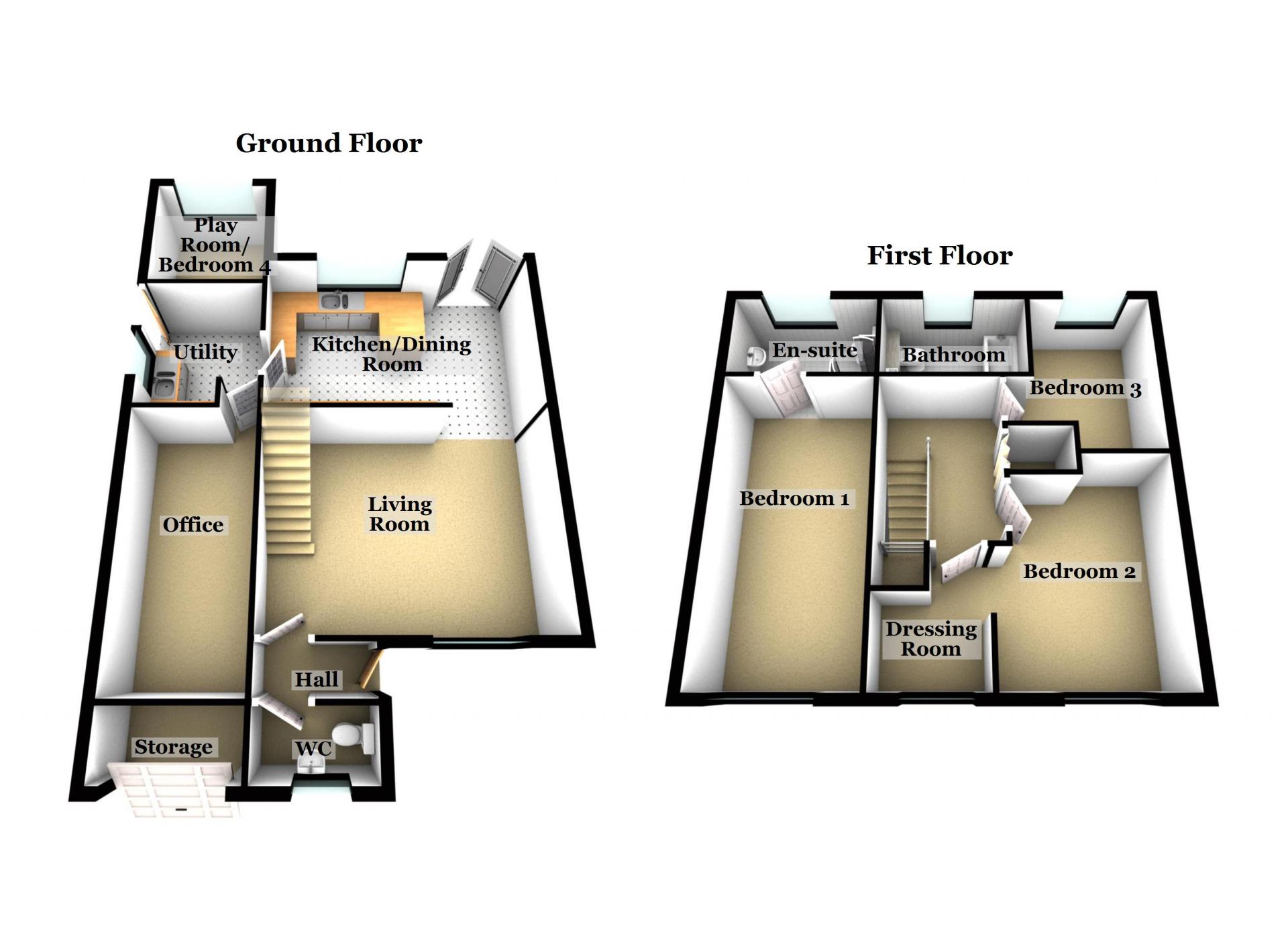 A separate utility room gives access a large home office and also a further reception room/ playroom that could be utilised as a fourth bedroom should you prefer. A door from the office leads to a useful storage space which completes the ground floor. Upstairs, expect to find the master bedroom with ensuite and well-proportioned second bedroom that benefits from a separate dressing area. A third bedroom and and family bathroom complete the upstairs whilst outside is a good-sized block paved gated driveway with parking for three vehicles and a lawned rear garden with decked seating area and shed.