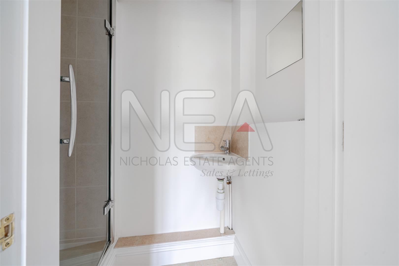 En-suite to bedrm two with shower cubicle and corner sink.