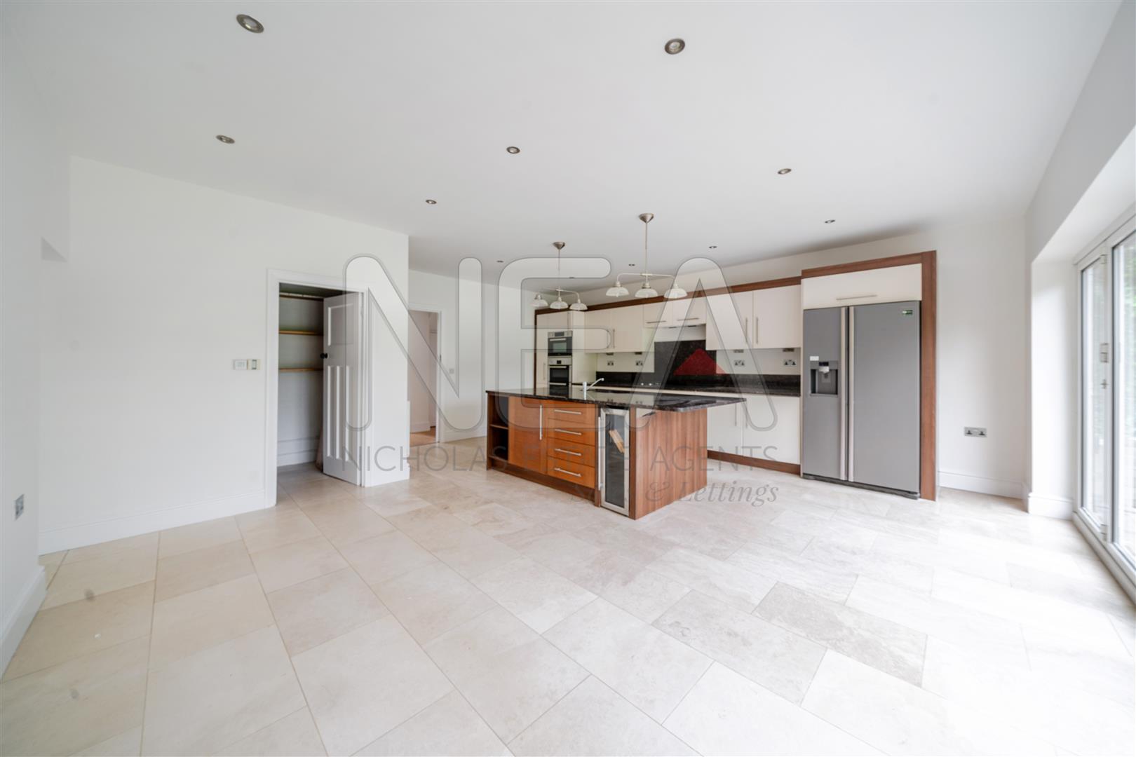 Tiled floor with under the floor heating, large island with built in double sink. Double oven, 2 ring gas hob + 4 induction hobs, built in dishwasher and plenty of storage and work space and a American style fridge/freezer with ice dispenser. A traditional larder room with shelving and Bio-fold doors to the garden.