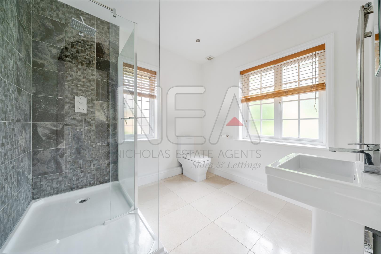 Dual aspect tiled floor en suite with a walk in cubicle shower, WC, oversize sink, heated towel radiator and shelves.