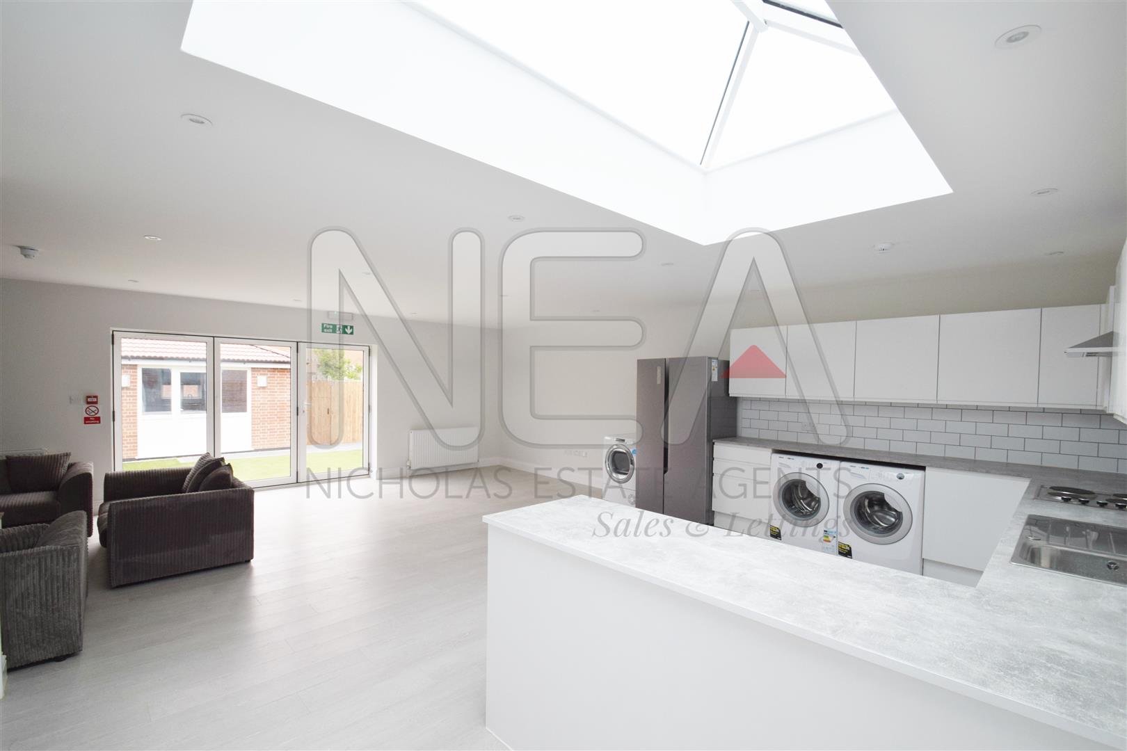 A modern contemporary, shared space with wood effect laminate flooring throughout, fully fitted kitchen (with two fridge/freezers, electric oven and hob, two washing machines and tumble dryer), dining area and lounge space. With bi-folding doors leading to the garden. Furniture includes, dining table and chairs, three sofas.