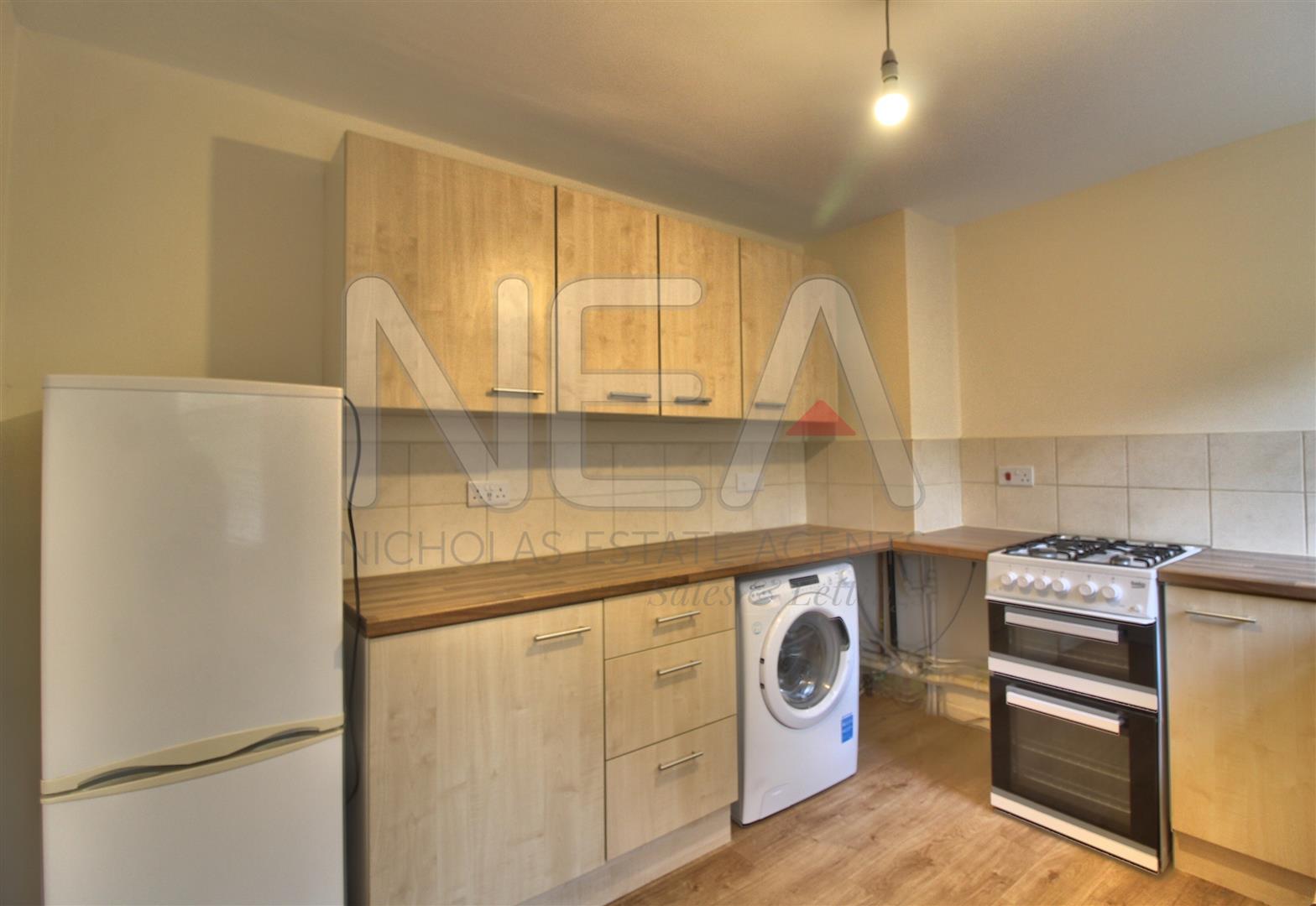 Good sized kitchen with wood effect flooring. There is a door to access the conservatory and a window looking into the garden. Appliances include washing machine, fridge/freezer and 4 ring gas hob.
