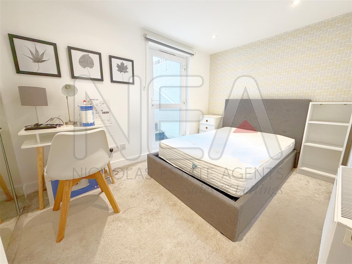Positioned in the basement at the rear of the property, this bedroom benefits from direct access to the garden. The room is furnished with a double ottoman bed for additional storage, bedside cabinets, a desk and chair, and a 32-inch TV.