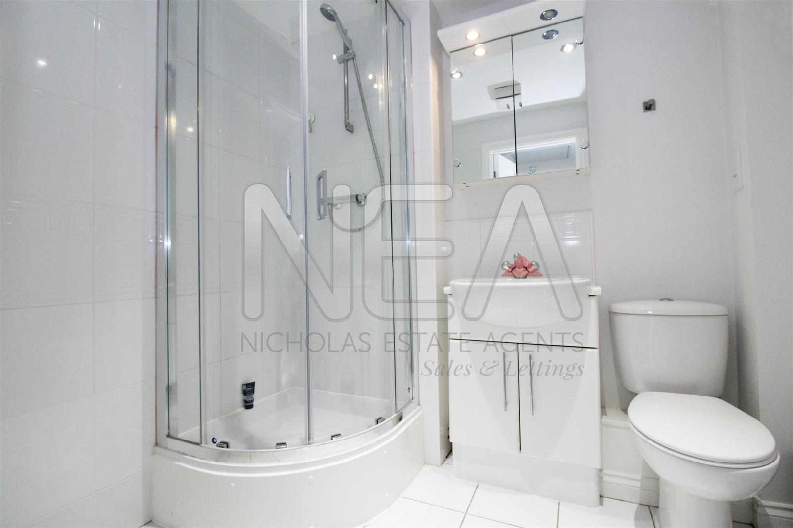 Shared shower room (shared with one other room only) with vinyl flooring. Sink built into cupboards with mirrored cupboard above and low level WC.