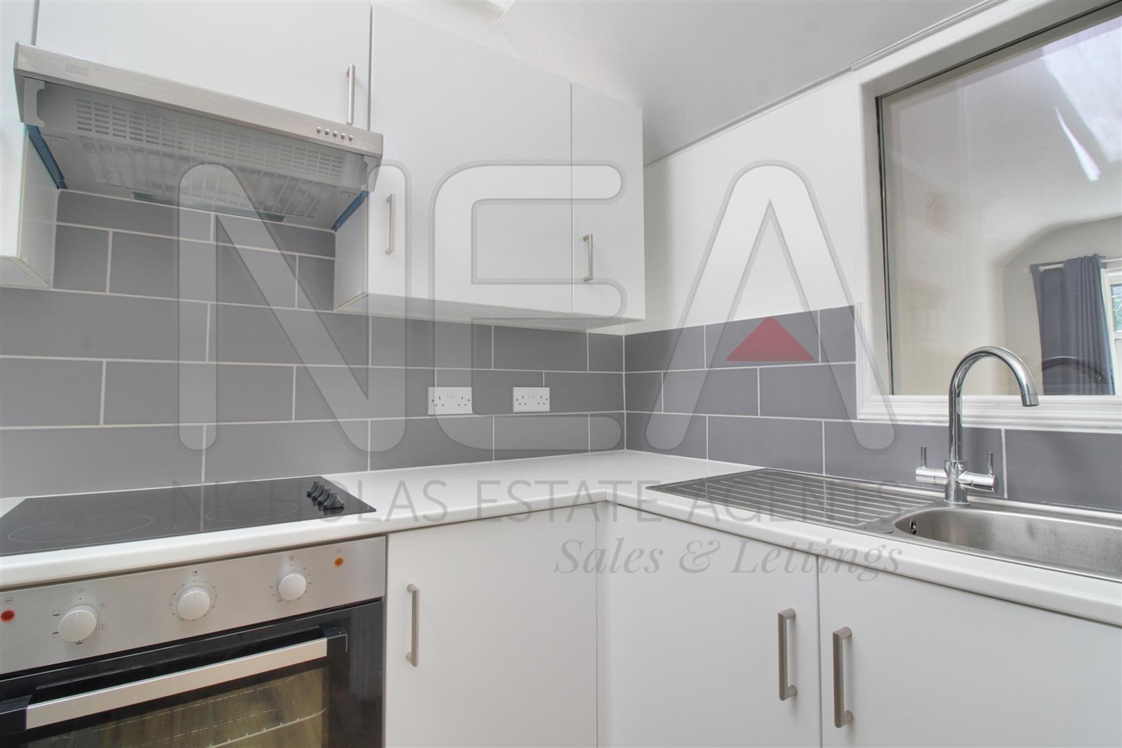 Modern kitchen with good amount of storage, halogen hob, extractor and built in oven. There is also a window to the living room that provides extra light.