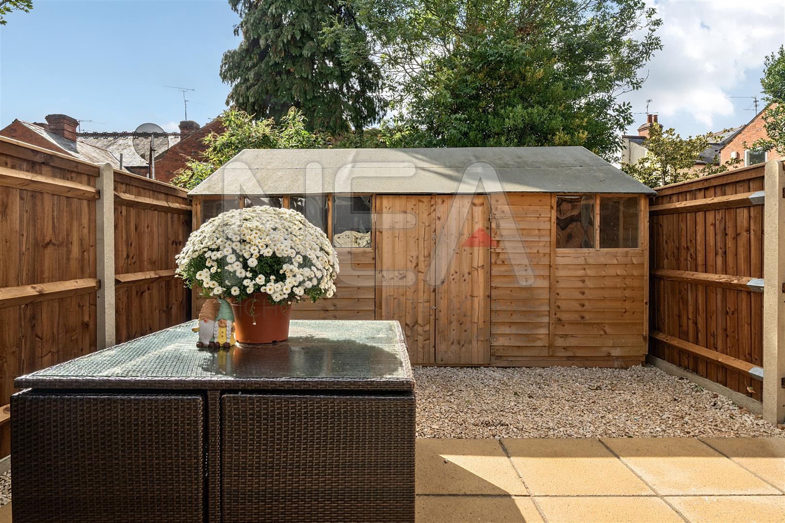 A rear enclosed garden, laid to patio. There is side access for bike access and a shed for storage.