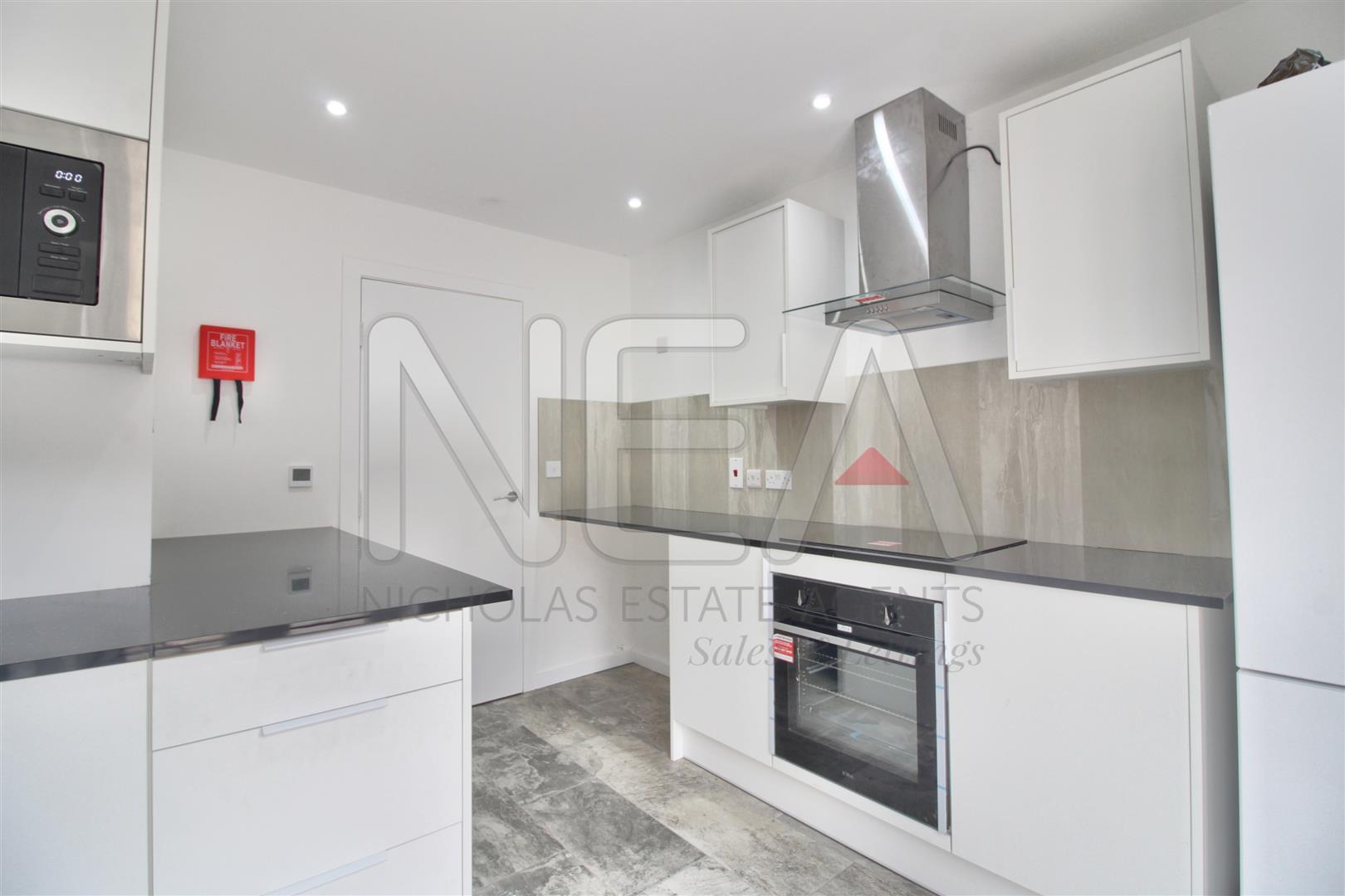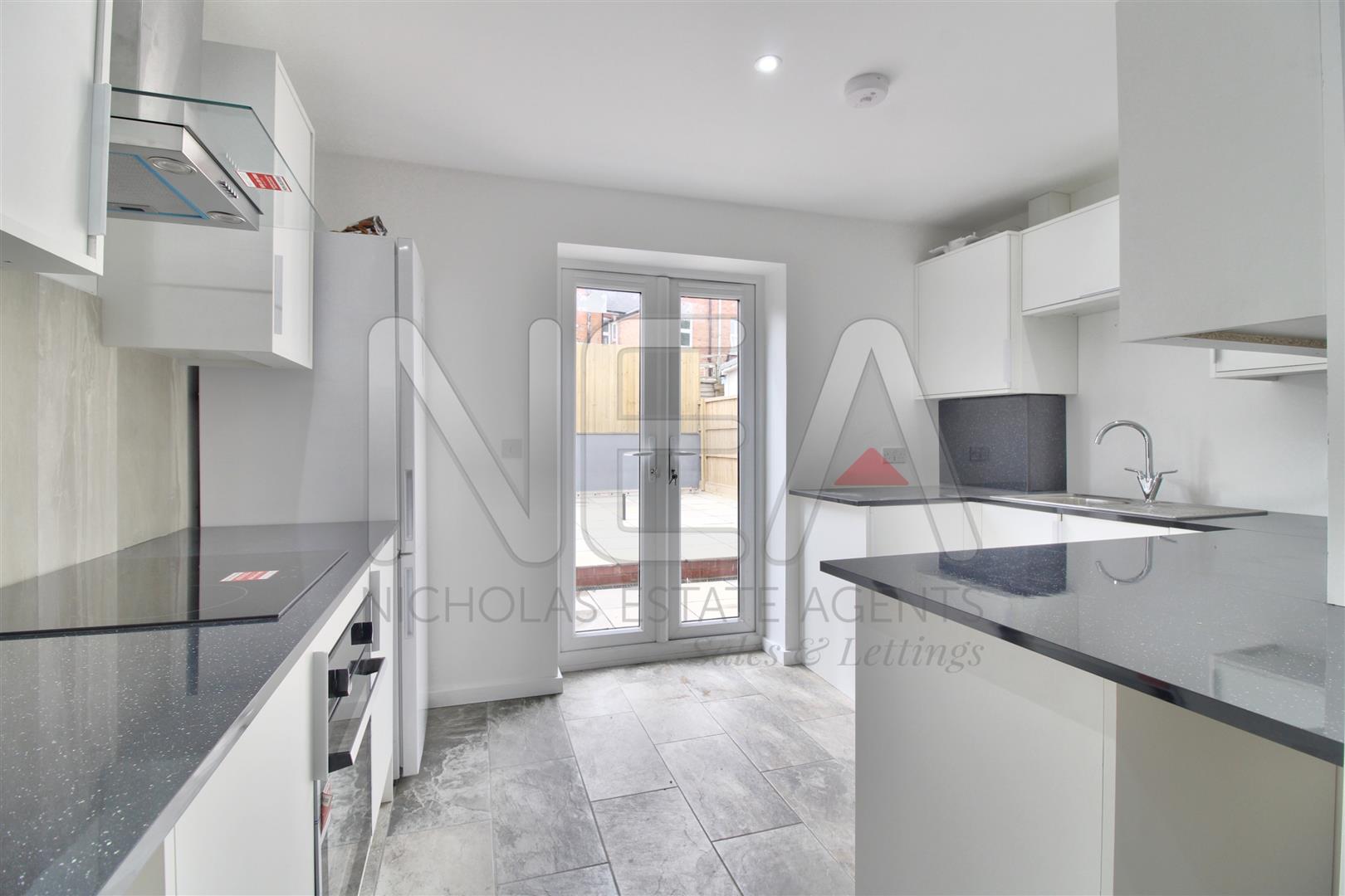 Modern communal kitchen with double glass doors to rear garden. There is plenty of cupboard and work top space. Appliances include fridge freezer, electric hob and oven.