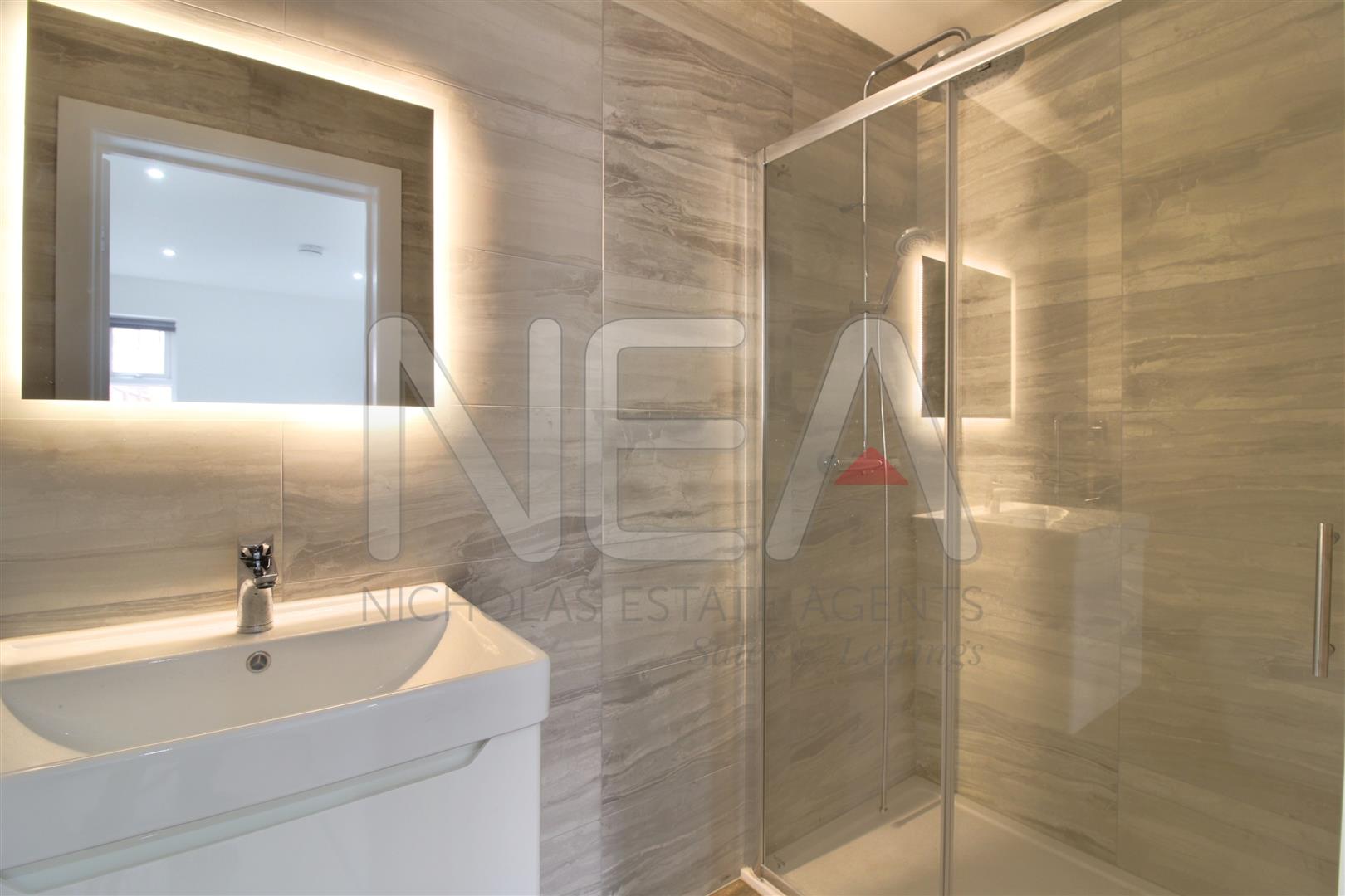 The tiled modern en-suite, has a large waterfall shower, sink set in storage, WC and heated towel rail.
