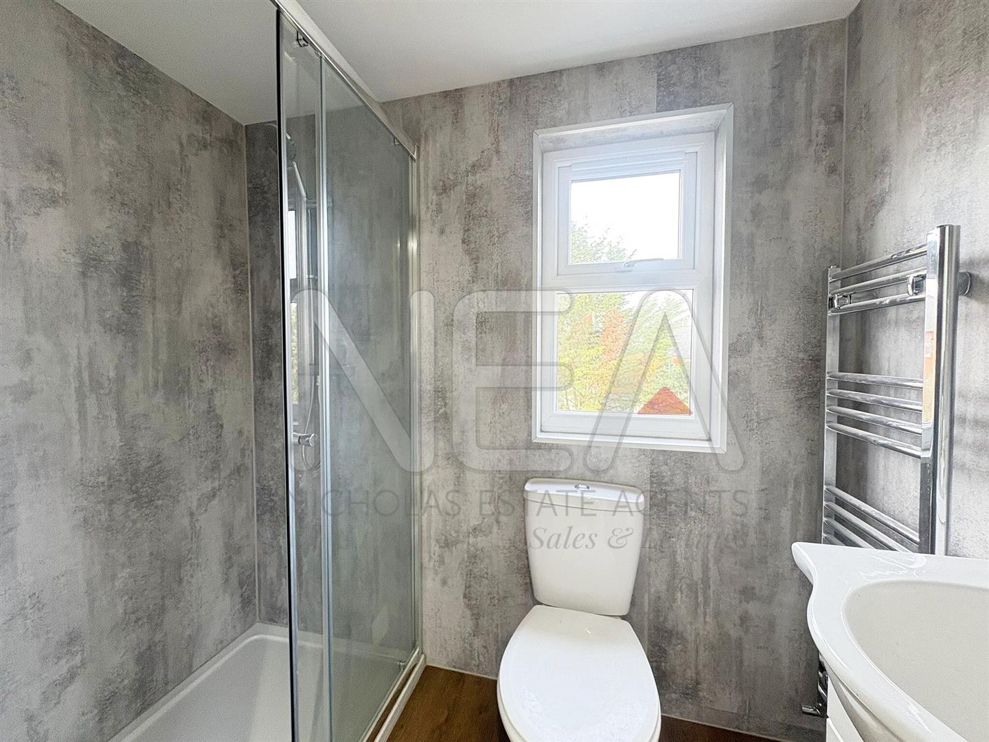 The en-suite is a stylish, modern marble-effect bathroom featuring a cubicle shower, WC, wash basin, and heated towel rail.