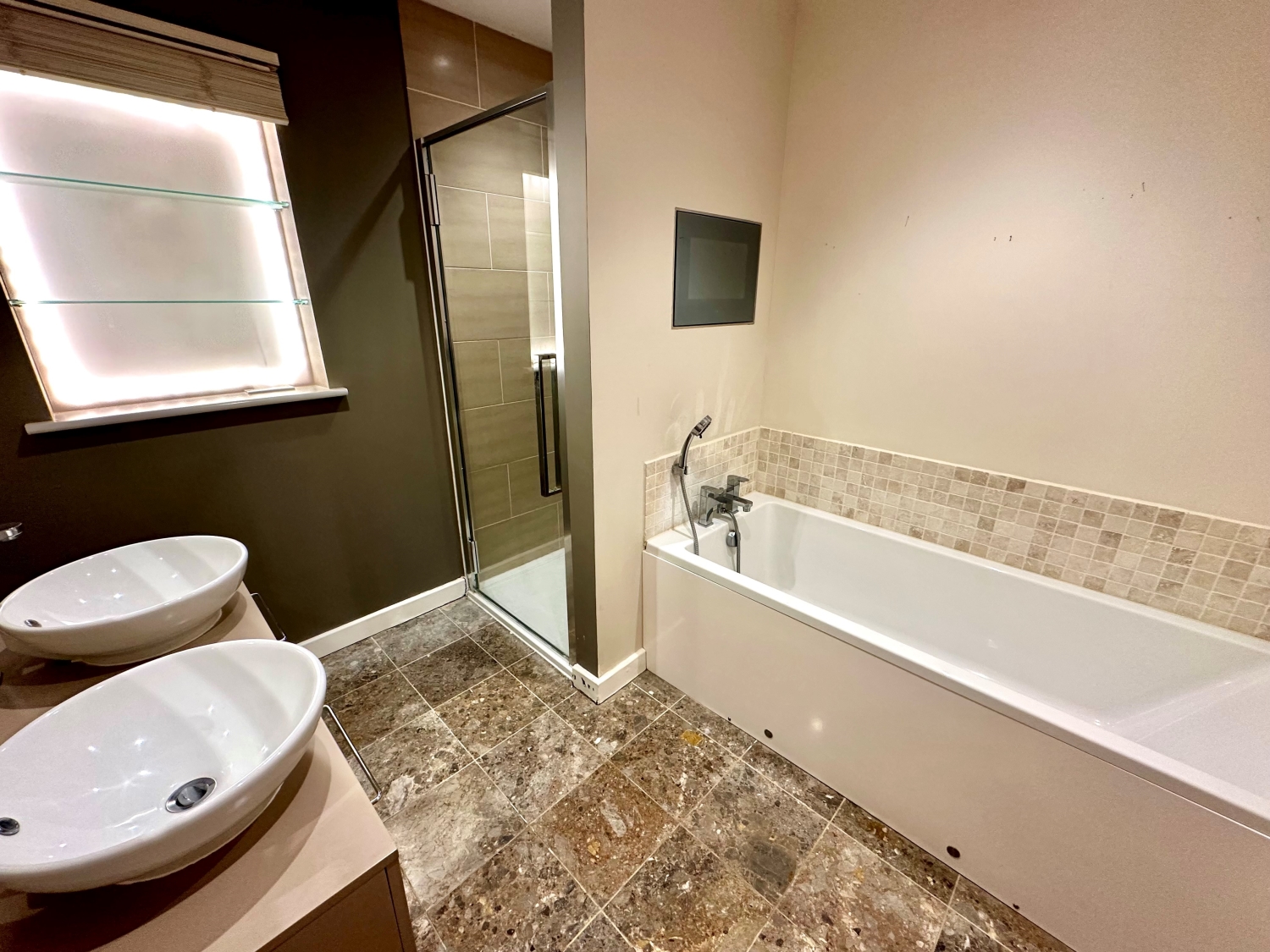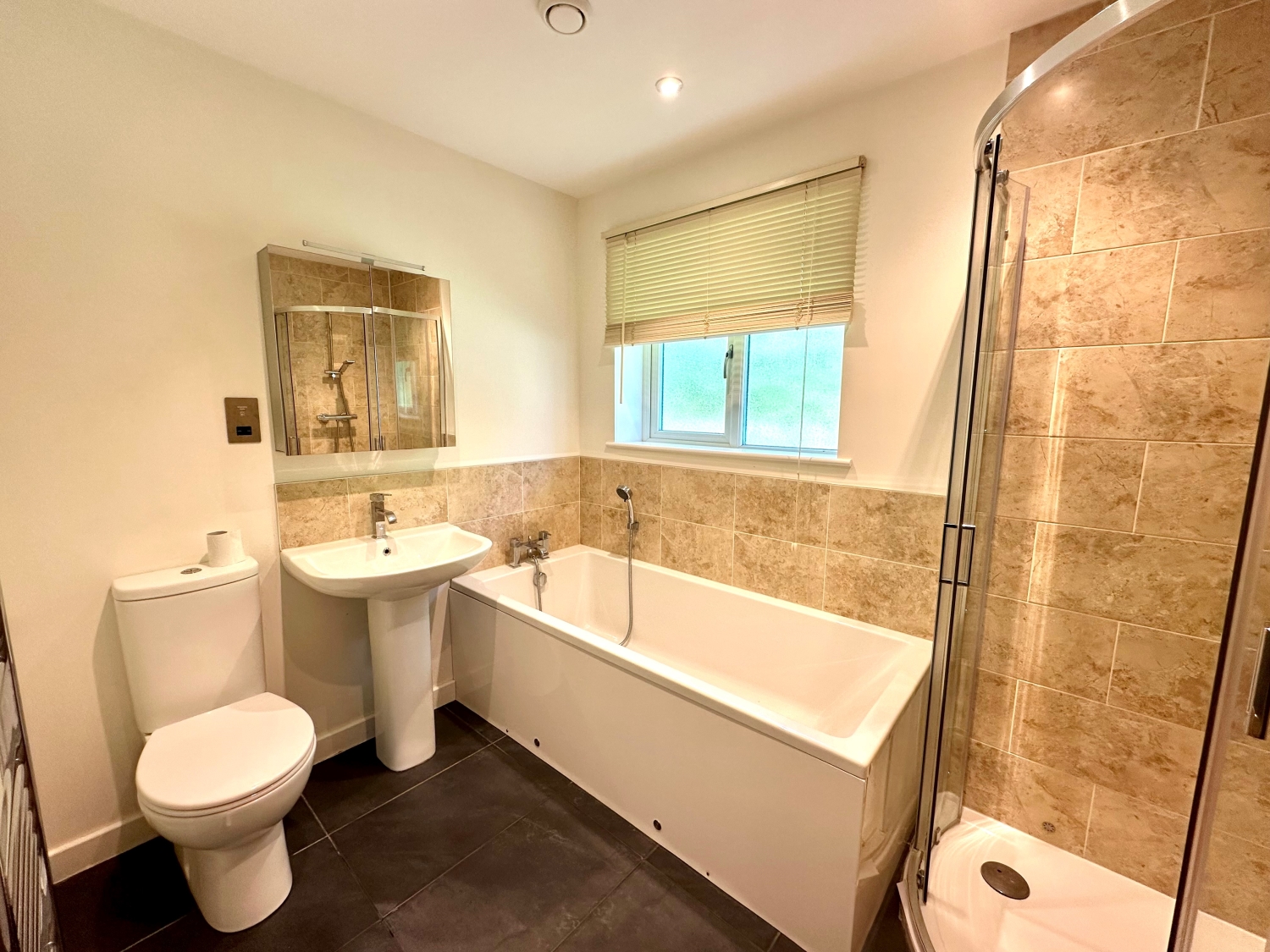 Family bathroom with a bath and overhead shower, corner shower, wash hand basin and w.c.