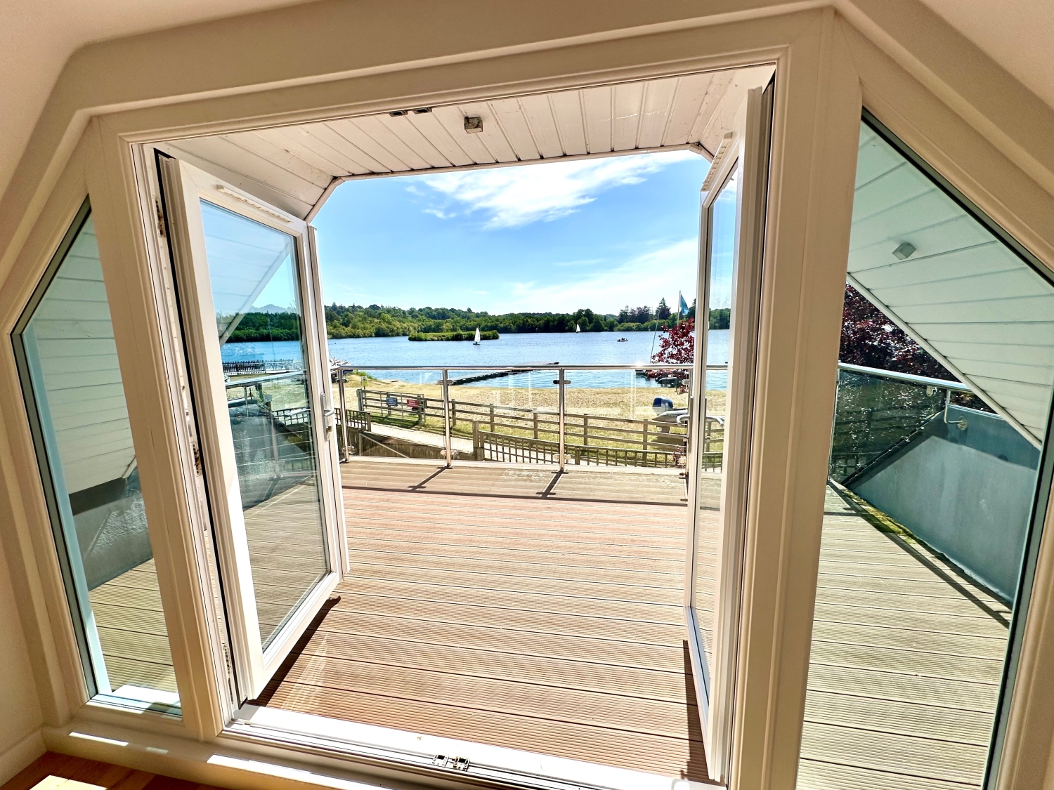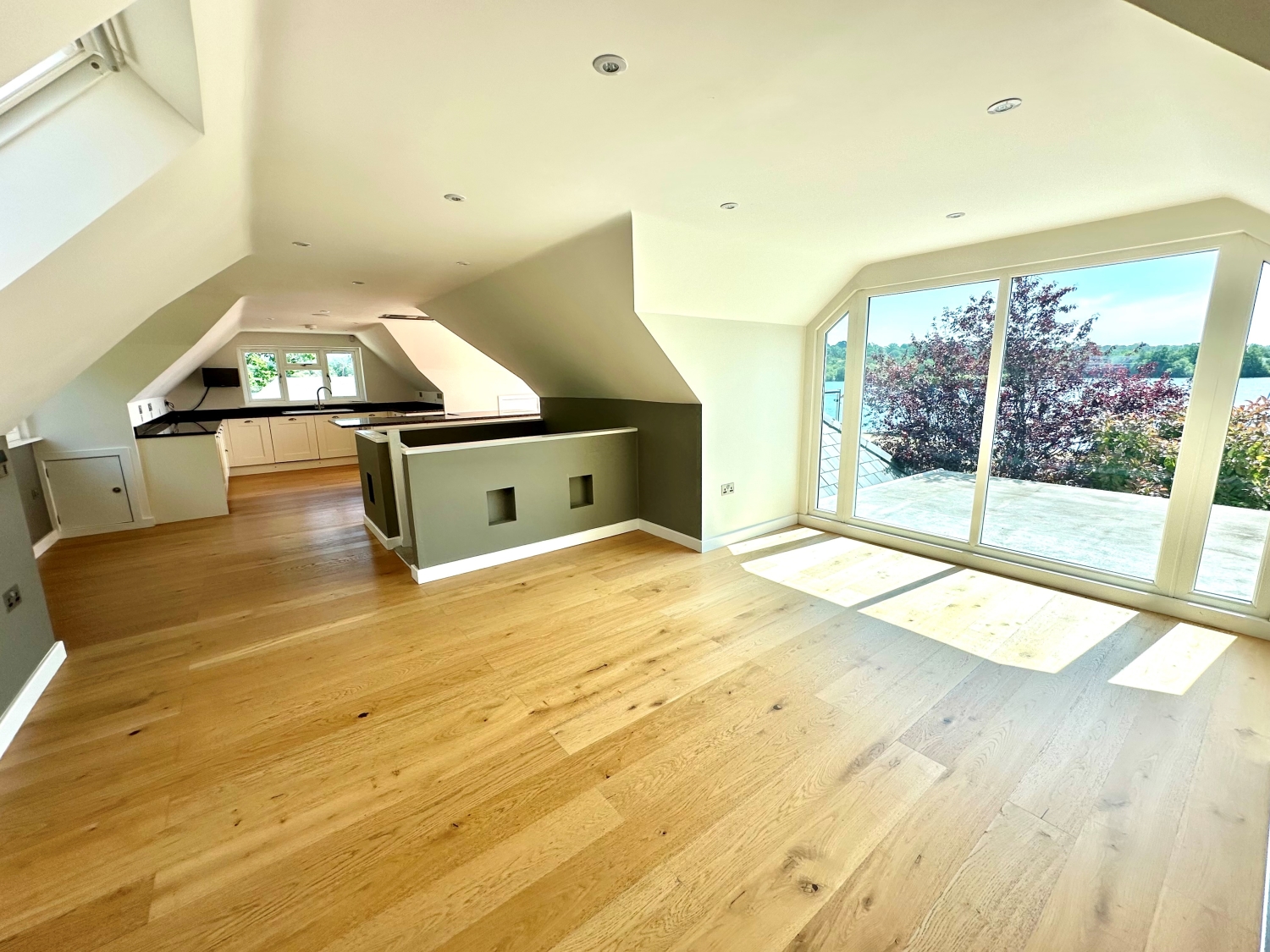 Central dining area with floor to ceiling picture window with panoramic lake views leads to the sitting room area. Feature wood burner and marble hearth. Stone tiled media wall with inset television and surround sound built-in speaker system.