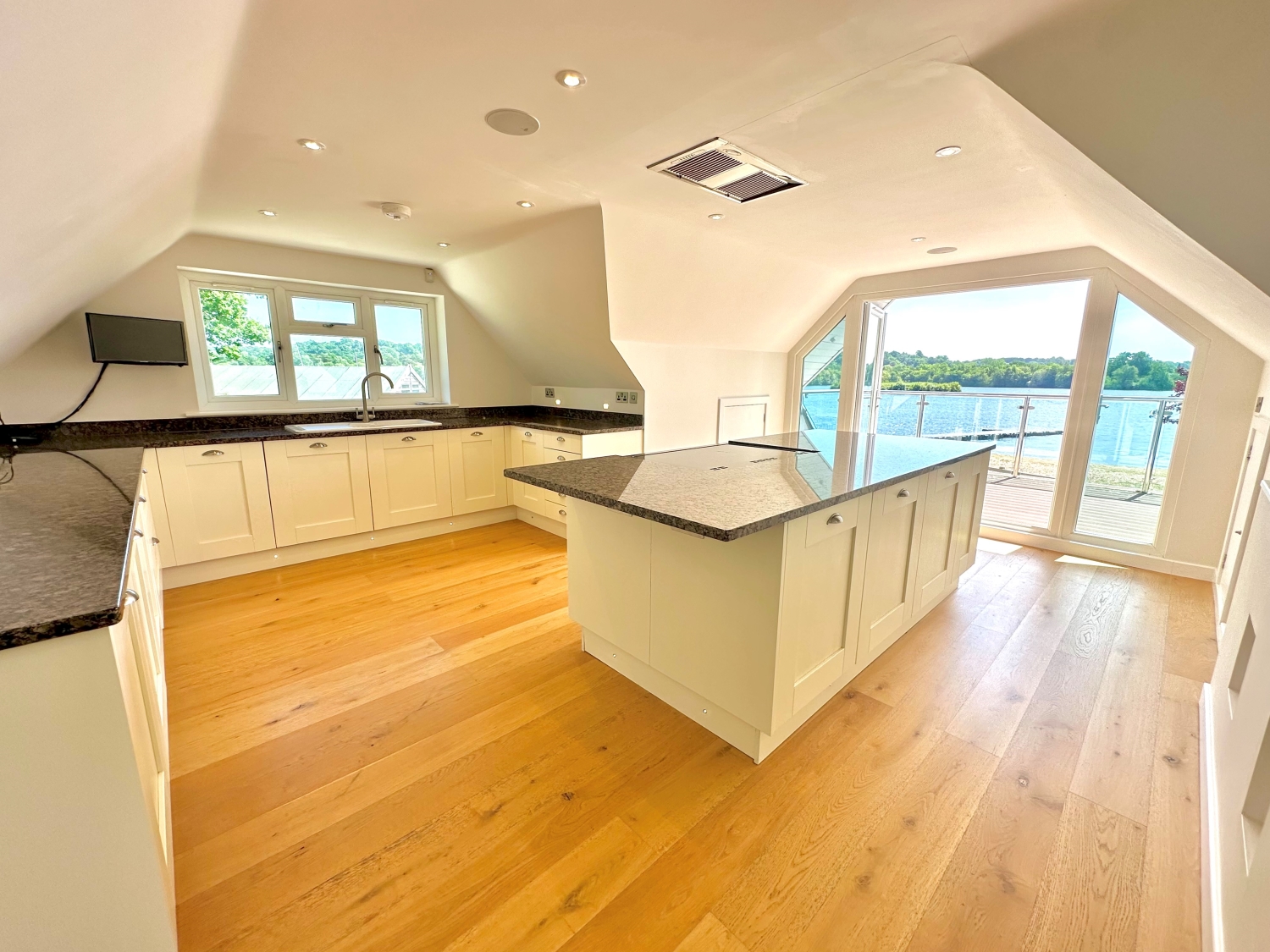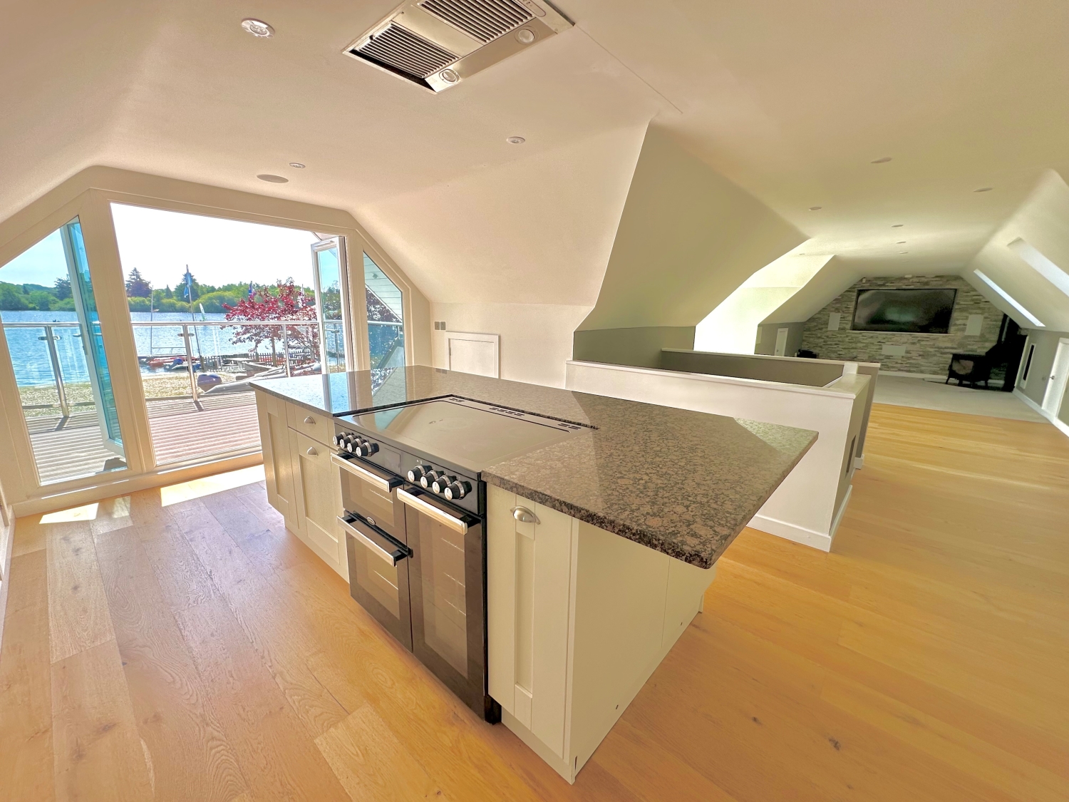 Open plan kitchen / sitting / dining room. Wrap around kitchen with matching wall and base units and stone work top. Integrated appliances including dishwasher, under counter fridge and Belling gas oven with induction hob and flush extractor fan. French doors opening onto a terraced decked balcony with galvanised steel balustrades and safety glass surround with stunning views of the Lakes.
