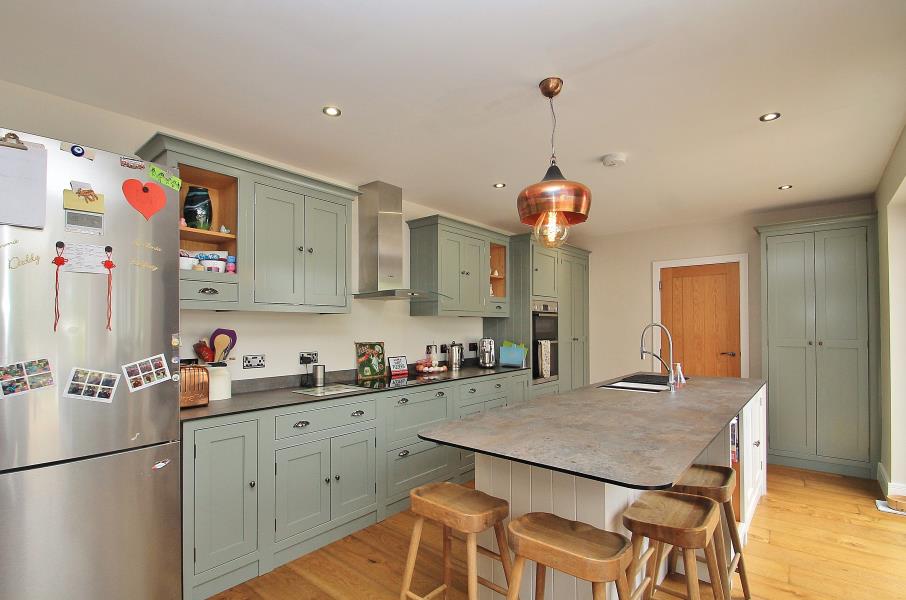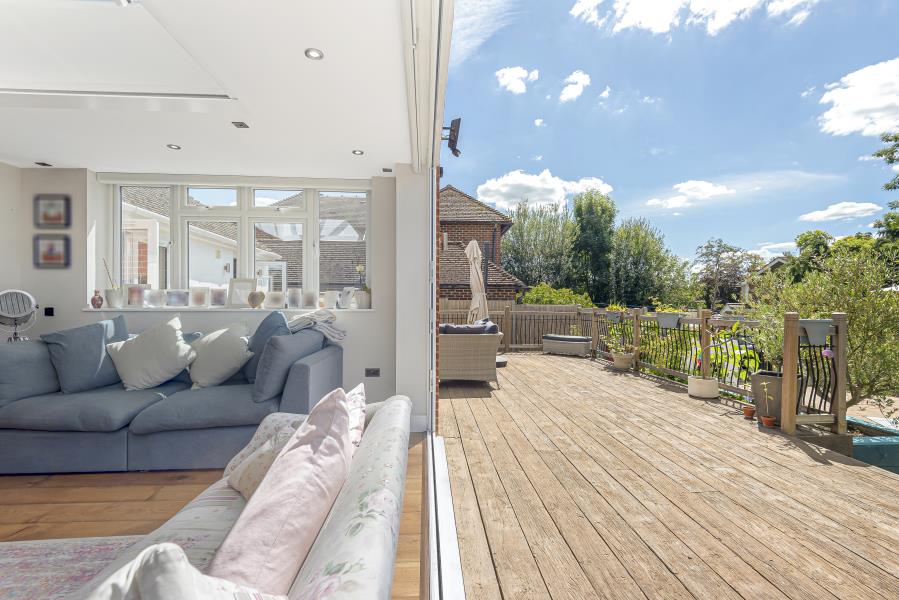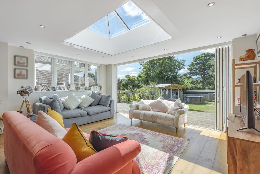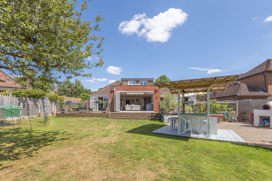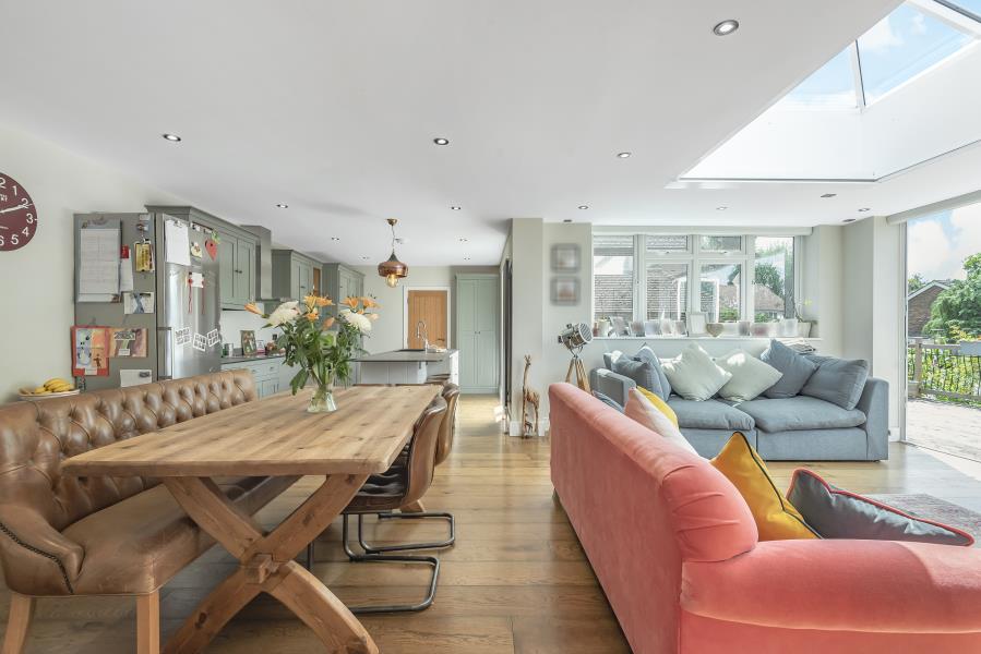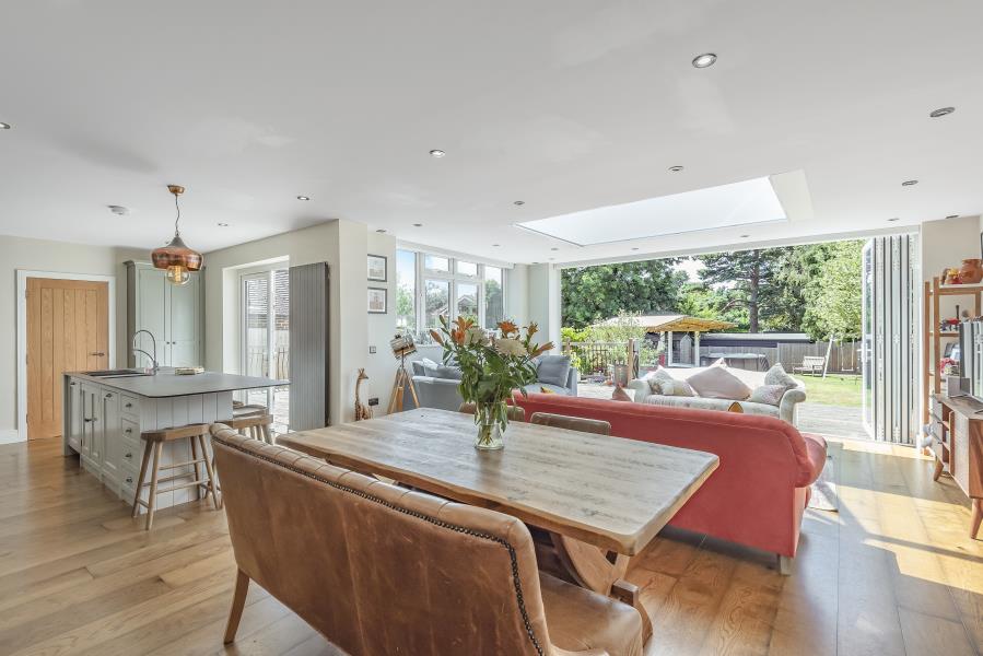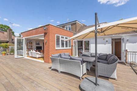 Unfurnished. A beautifully presented detached five bedroom chalet bungalow set in a private and prestigious road within Send Village. The property has a generous entrance hall which leads into a large and light open plan reception room with a large ceiling lantern, wooden underfloor heating with bi folding doors leading onto a raised decking area. There is a beautifully presented bespoke and hand made kitchen with high end integrated appliances and island and separate utility room. There are three ground floor bedrooms and a family bathroom. Upstairs comprises two further bedrooms with a master ensuite and walk in wardrobe. To the front is a large gravel driveway providing ample parking and to the rear is a large and private garden with composite decking leading down to the main garden. There is a garden kitchen with a wood fired pizza oven and BBQ alongside a lovely covered seating area. Excellent links to Guildford and Woking Town centres, mainline stations, A3 and M25. Excellent local schools. EPC rating D.