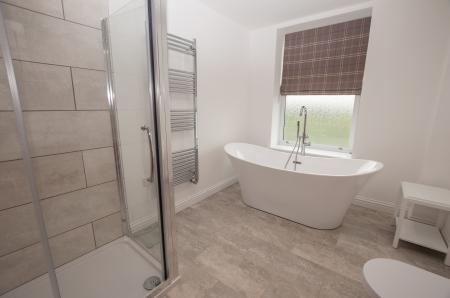 The attractive family bathroom features another walk-in, dual-head shower, plus a roll top bath, vanity unit, WC and chrome-heated towel rail.