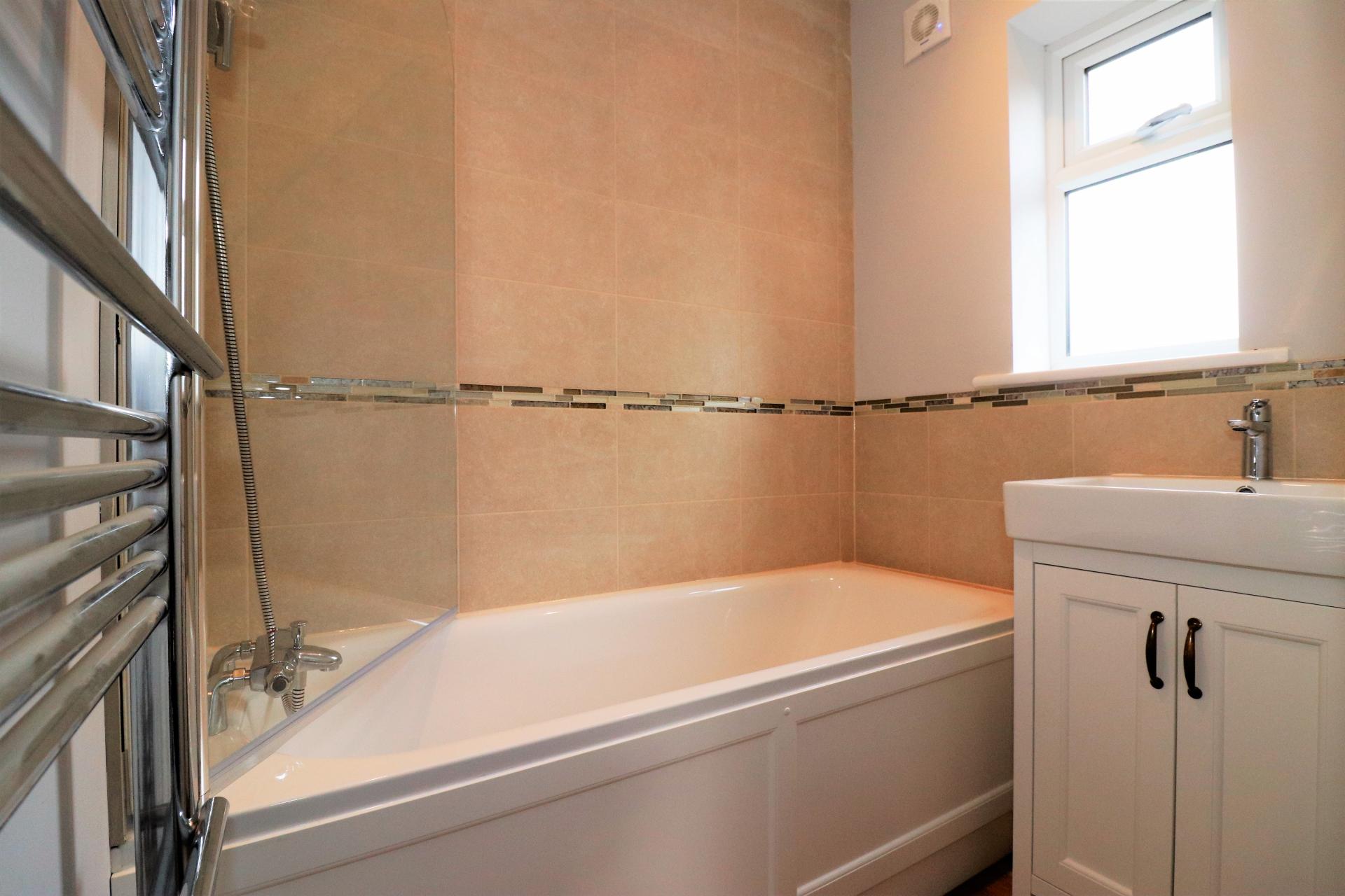 Front door to Entrance Hallway which in turn leads to; Double aspect Living Room, Kitchen fitted with a gas hob and electric oven with extractor hood over, integrated washing machine and space for a fridge/freezer. There is also side access via the Kitchen to the rear Garden. A well appointed Family Bathroom with an attractive modern suite including a shower over the bath and separate W/C with matching fixtures complete the ground floor accommodation.