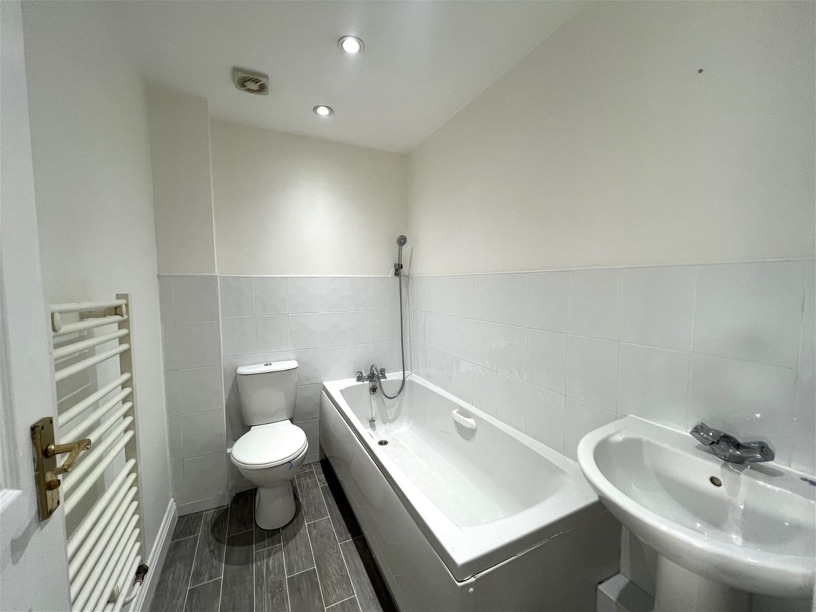 Featuring a three -piece suite finished in white comprising a panelled bath with a shower attachment, a low flush W.C. and a pedestal wash hand basin. The room has partial tiling to the walls, spot lights to the ceiling, an extraction unit to the ceiling and a towel radiator.